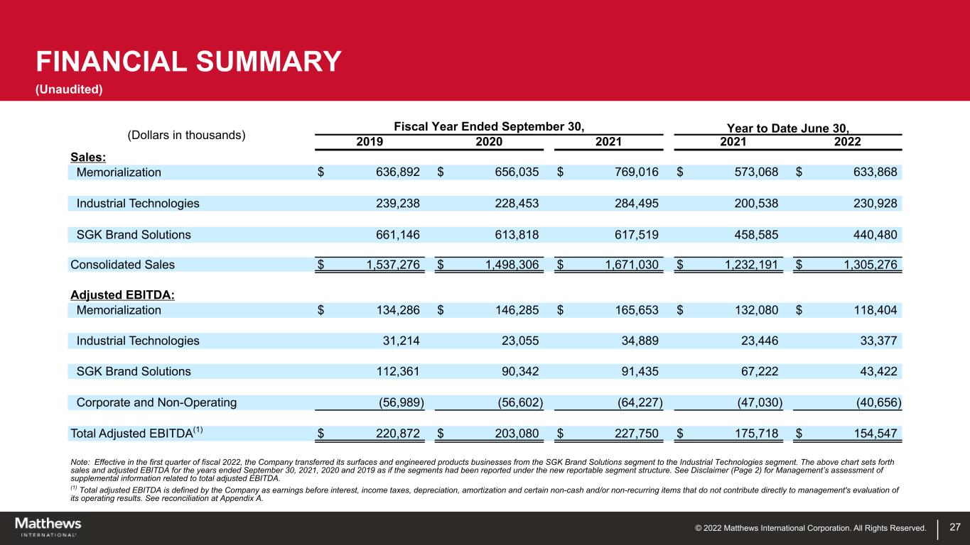© 2022 Matthews International Corporation. All Rights Reserved. 2 DISCLAIMER Any forward-looking statements contained in this presentation are included pursuant to the “safe harbor” provisions of the Private Securities Litigation Reform Act of 1995. Such forward-looking statements involve known and unknown risks and uncertainties that may cause the Company’s actual results in future periods to be materially different from management’s expectations. Although the Company believes that the expectations reflected in such forward-looking statements are reasonable, no assurance can be given that such expectations will prove correct. Factors that could cause the Company's results to differ materially from the results discussed in such forward-looking statements principally include changes in domestic or international economic conditions, changes in foreign currency exchange rates, changes in the cost of materials used in the manufacture of the Company's products, changes in mortality and cremation rates, changes in product demand or pricing as a result of consolidation in the industries in which the Company operates, or other factors such as supply chain disruptions, labor shortages or labor cost increases, changes in product demand or pricing as a result of domestic or international competitive pressures, ability to achieve cost-reduction objectives, unknown risks in connection with the Company's acquisitions, cybersecurity concerns, effectiveness of the Company's internal controls, compliance with domestic and foreign laws and regulations, technological factors beyond the Company's control, impact of pandemics or similar outbreaks, or other disruptions to our industries, customers, or supply chains, the impact of global conflicts, such as the current war between Russia and Ukraine, and other factors described in the Company’s Annual Report on Form 10-K and other periodic filings with the U.S. Securities and Exchange Commission ("SEC"). The information contained in this presentation, including any financial data, is made as of June 30, 2022 unless otherwise noted. The Company does not, and is not obligated to, update this information after the date of such information. Included in this report are measures of financial performance that are not defined by generally accepted accounting principles in the United States (“GAAP”). The Company uses non-GAAP financial measures to assist in comparing its performance on a consistent basis for purposes of business decision-making by removing the impact of certain items that management believes do not directly reflect the Company’s core operations including acquisition costs, ERP integration costs, strategic initiative and other charges (which includes non- recurring charges related to operational initiatives and exit activities), stock-based compensation and the non-service portion of pension and postretirement expense. Management believes that presenting non-GAAP financial measures is useful to investors because it (i) provides investors with meaningful supplemental information regarding financial performance by excluding certain items that management believes do not directly reflect the Company’s core operations, (ii) permits investors to view performance using the same tools that management uses to budget, forecast, make operating and strategic decisions, and evaluate historical performance, and (iii) otherwise provides supplemental information that may be useful to investors in evaluating the Company’s results. The Company believes that the presentation of these non-GAAP financial measures, when considered together with the corresponding GAAP financial measures and the reconciliations to those measures, provided herein, provides investors with an additional understanding of the factors and trends affecting the Company’s business that could not be obtained absent these disclosures. The Company believes that adjusted EBITDA provides relevant and useful information, which is used by the Company’s management in assessing the performance of its business. Adjusted EBITDA is defined by the Company as earnings before interest, income taxes, depreciation, amortization and certain non-cash and/or non-recurring items that do not contribute directly to management’s evaluation of its operating results. These items include stock-based compensation, the non-service portion of pension and postretirement expense, acquisition costs, ERP integration costs, and strategic initiatives and other charges. Adjusted EBITDA provides the Company with an understanding of earnings before the impact of investing and financing charges and income taxes, and the effects of certain acquisition and ERP integration costs, and items that do not reflect the ordinary earnings of the Company’s operations. This measure may be useful to an investor in evaluating operating performance. It is also useful as a financial measure for lenders and is used by the Company’s management to measure business performance. Adjusted EBITDA is not a measure of the Company's financial performance under GAAP and should not be considered as an alternative to net income or other performance measures derived in accordance with GAAP, or as an alternative to cash flow from operating activities as a measure of the Company's liquidity. The Company's definition of adjusted EBITDA may not be comparable to similarly titled measures used by other companies. The Company has also presented adjusted net income and adjusted earnings per share and believes each measure provides relevant and useful information, which is widely used by analysts and investors, as well as by the Company’s management in assessing the performance of its business. Adjusted net income and adjusted earnings per share provides the Company with an understanding of the results from the primary operations of our business by excluding the effects of certain acquisition and system- integration costs, and items that do not refl