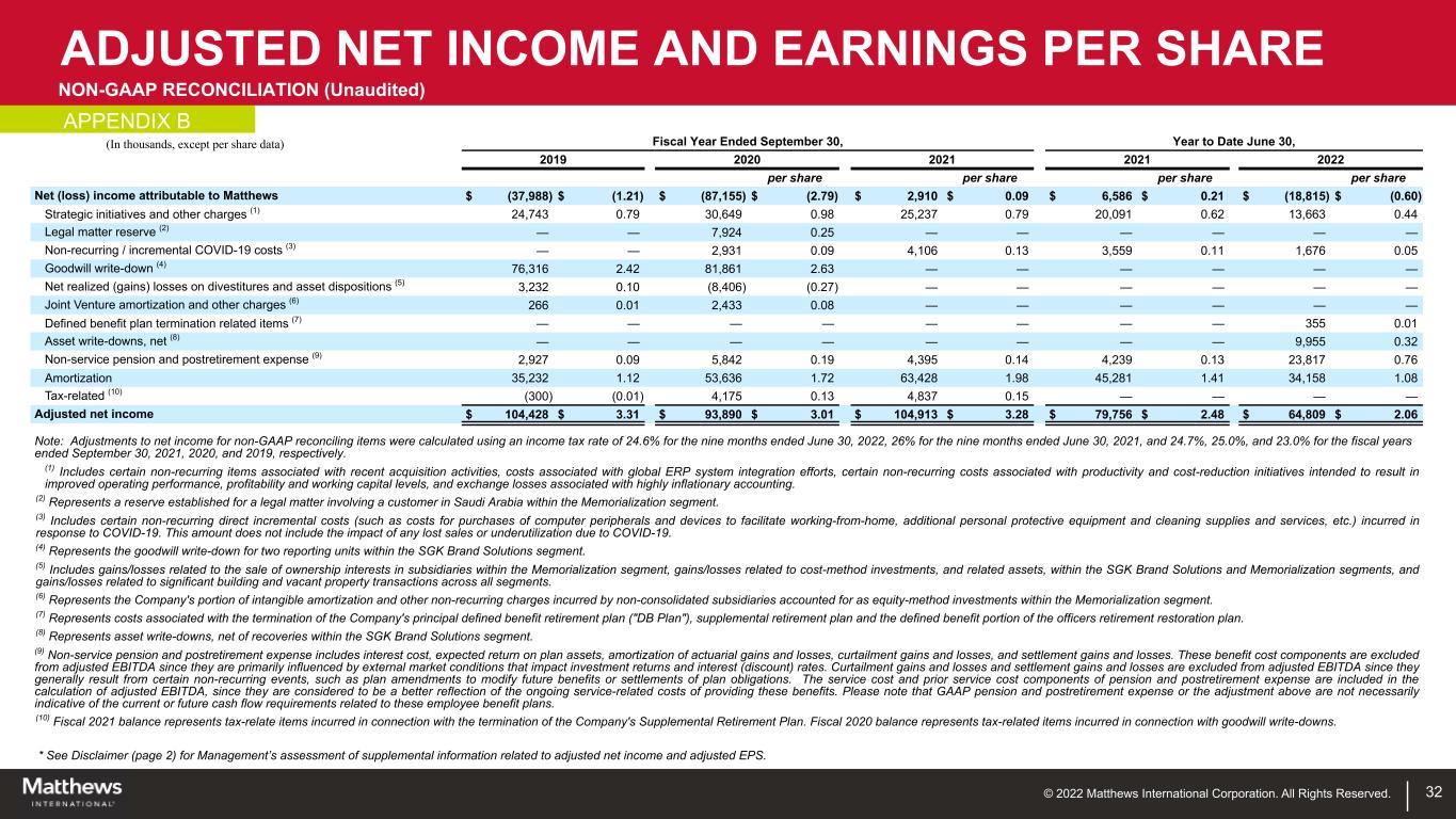 © 2022 Matthews International Corporation. All Rights Reserved. TOTAL ADJUSTED EBITDA NON-GAAP RECONCILIATION (Unaudited) * See Disclaimer (page 2) for Management’s assessment of supplemental information related to adjusted EBITDA. 31 (In thousands, except per share data) Fiscal Year Ended September 30, Year to Date June 30, 2019 2020 2021 2021 2022 Net (loss) income $ (38,889) $ (87,652) $ 2,858 $ 6,526 $ (18,871) Income tax provision (benefit) 806 (18,685) 6,375 2,627 (2,311) (Loss) income before income taxes (38,083) (106,337) 9,233 9,153 (21,182) Net loss attributable to noncontrolling interests 901 497 52 60 56 Interest expense 40,962 34,885 28,684 21,709 19,426 Depreciation and amortization 90,793 119,058 133,512 97,919 80,163 Strategic initiatives and other charges (1) 31,829 40,686 29,539 23,498 17,863 Legal matter reserve (2) — 10,566 — — — Non-recurring / incremental coronavirus disease 2019 ("COVID-19") costs (3) — 3,908 5,312 4,689 2,204 Goodwill write-down (4) 77,572 90,408 — — — Net realized (gain) loss on divestitures and asset dispositions: Loss (gain) on sale of ownership interests in subsidiaries (5) 6,469 (11,208) — — — Realized (gain) loss on cost method investments (6) 4,731 — — — — Net gains from the sale of buildings and vacant properties (7) (7,347) — — — — Joint Venture depreciation, amortization, interest expense and other charges (8) 1,514 4,732 — — — Defined benefit plan termination related items (9) — — — — 284 Asset write-downs, net (10) — — — — 10,017 Stock-based compensation 7,729 8,096 15,581 12,960 14,128 Non-service pension and postretirement expense (11) 3,802 7,789 5,837 5,730 31,588 Total Adjusted EBITDA $ 220,872 $ 203,080 $ 227,750 $ 175,718 $ 154,547 (1) Includes certain non-recurring items associated with recent acquisition activities, costs associated with global ERP system integration efforts, certain non-recurring costs associated with productivity and cost-reduction initiatives intended to result in improved operating performance, profitability and working capital levels, and exchange losses associated with highly inflationary accounting. (2) Represents a reserve established for a legal matter involving a letter of credit for a customer in Saudi Arabia within the Memorialization segment. (3) Includes certain non-recurring direct incremental costs (such as costs for purchases of computer peripherals and devices to facilitate working-from-home, additional personal protective equipment and cleaning supplies and services, etc.) incurred in response to COVID-19. This amount does not include the impact of any lost sales or underutilization due to COVID-19. (4) Represents the goodwill write-down for two reporting units within the SGK Brand Solutions segment. (5) Represents the loss (gain) on the sale of ownership interests in subsidiaries within the Memorialization segment. (6) Includes gains/losses related to cost-method investments, and related assets, within the SGK Brand Solutions and Memorialization segments (7) Includes gains/losses related to significant building and vacant property transactions across all segments. (8) Represents the Company's portion of depreciation, intangible amortization, interest expense, and other non-recurring charges incurred by non-consolidated subsidiaries accounted for as equity-method investments within the Memorialization segment. (9) Represents costs associated with the termination of the Company's principal defined benefit retirement plan ("DB Plan"), supplemental retirement plan and the defined benefit portion of the officers retirement restoration plan. (10) Represents asset write-downs, net of recoveries within the SGK Brand Solutions segment. (11) Non-service pension and postretirement expense includes interest cost, expected return on plan assets, amortization of actuarial gains and losses, curtailment gains and losses, and settlement gains and losses. These benefit cost components are excluded from adjusted EBITDA since they are primarily influenced by external market conditions that impact investment returns and interest (discount) rates. Curtailment gains and losses and settlement gains and losses are excluded from adjusted EBITDA since they generally result from certain non-recurring events, such as plan amendments to modify future benefits or settlements of plan obligations. The service cost and prior service cost components of pension and postretirement expense are included in the calculation of adjusted EBITDA, since they are considered to be a better reflection of the ongoing service-related costs of providing these benefits. Please note that GAAP pension and postretirement expense or the adjustment above are not necessarily indicative of the current or future cash flow requirements related to these employee benefit plans. APPENDIX A