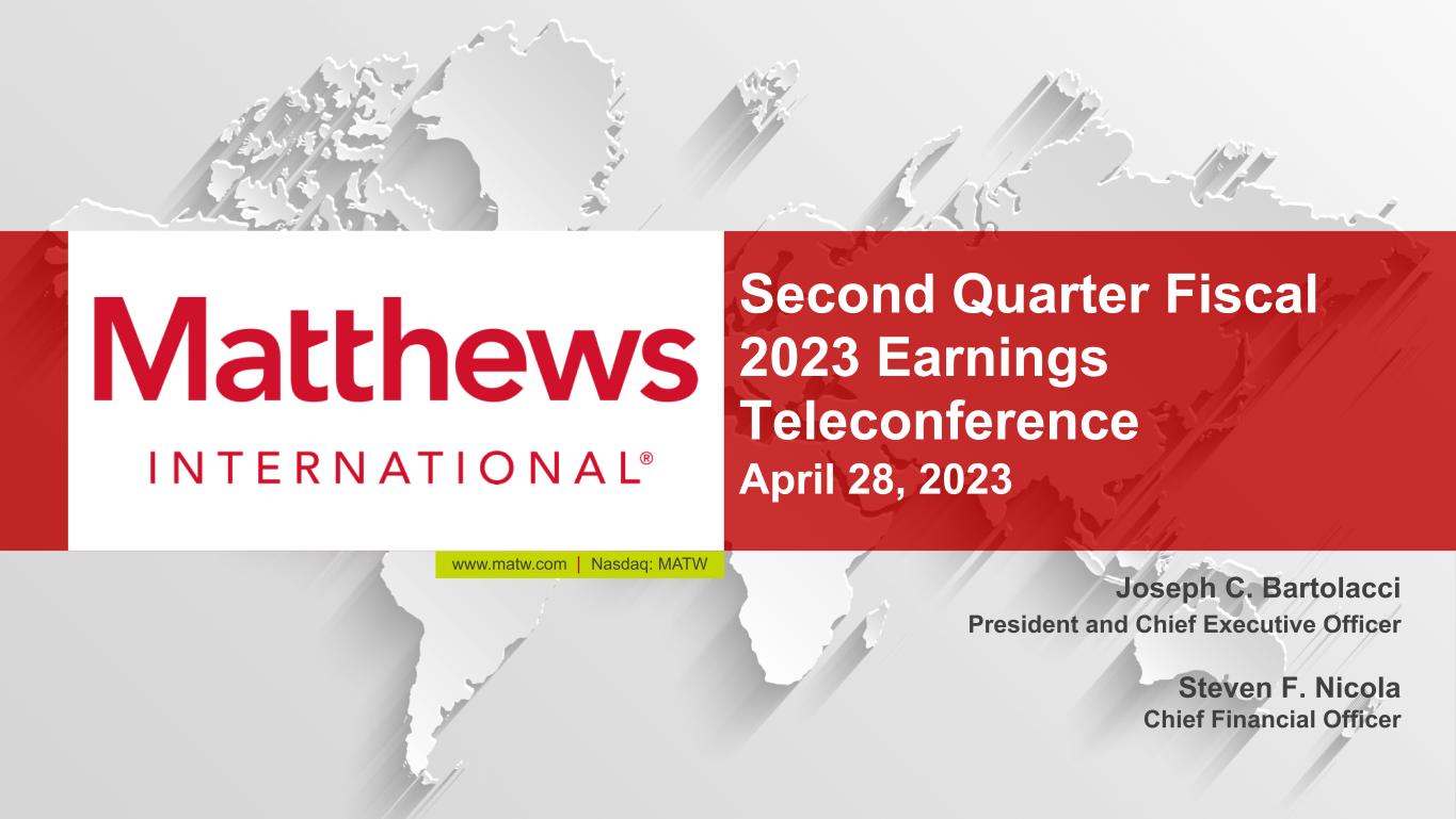 www.matw.com | Nasdaq: MATW Second Quarter Fiscal 2023 Earnings Teleconference April 28, 2023 Joseph C. Bartolacci President and Chief Executive Officer Steven F. Nicola Chief Financial Officer