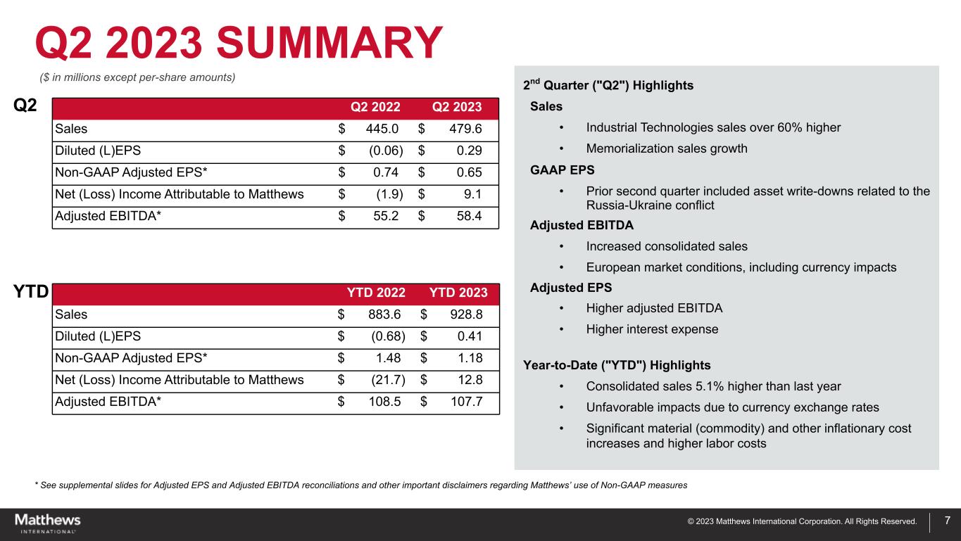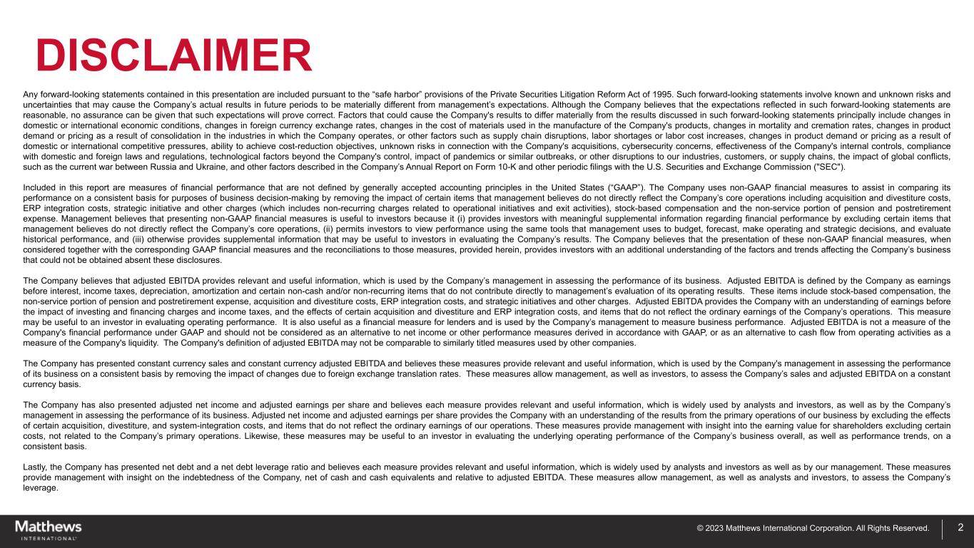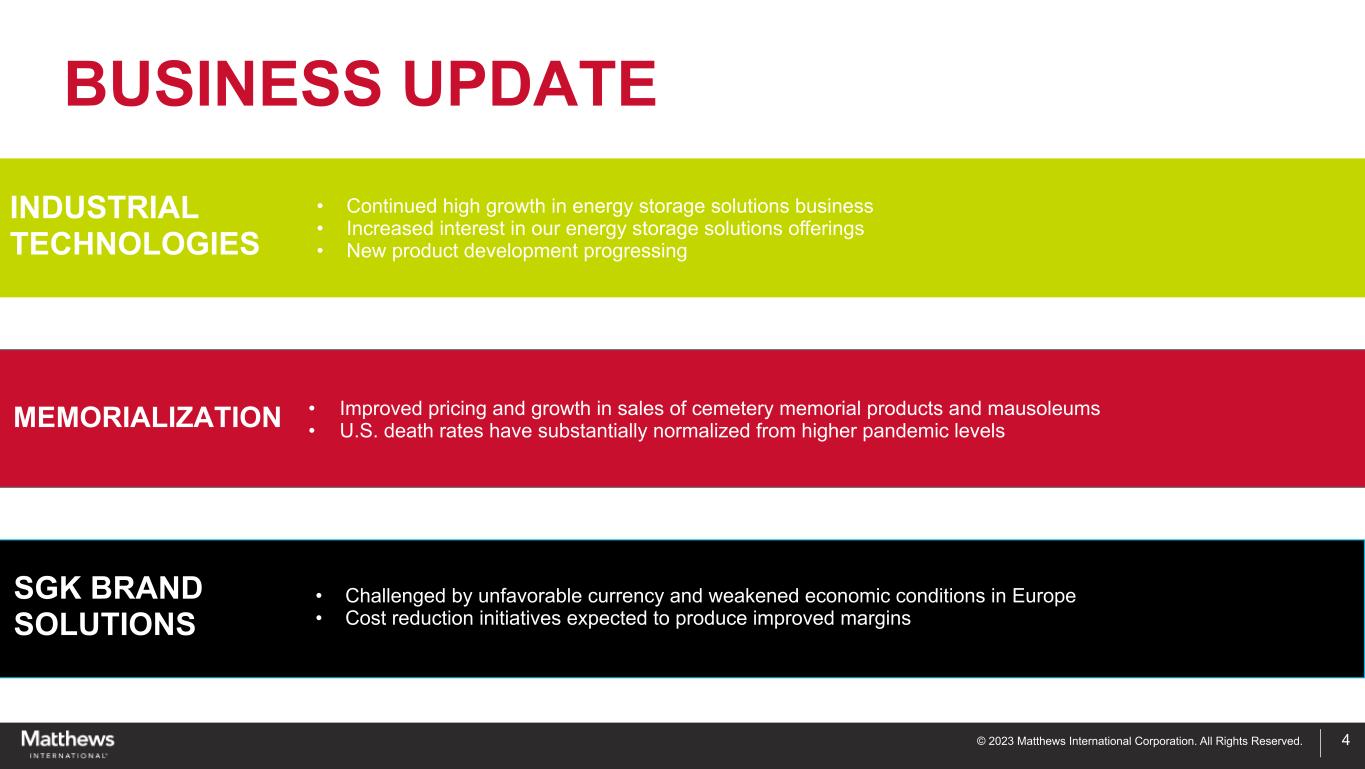 © 2023 Matthews International Corporation. All Rights Reserved. DISCLAIMER 2 Any forward-looking statements contained in this presentation are included pursuant to the “safe harbor” provisions of the Private Securities Litigation Reform Act of 1995. Such forward-looking statements involve known and unknown risks and uncertainties that may cause the Company’s actual results in future periods to be materially different from management’s expectations. Although the Company believes that the expectations reflected in such forward-looking statements are reasonable, no assurance can be given that such expectations will prove correct. Factors that could cause the Company's results to differ materially from the results discussed in such forward-looking statements principally include changes in domestic or international economic conditions, changes in foreign currency exchange rates, changes in the cost of materials used in the manufacture of the Company's products, changes in mortality and cremation rates, changes in product demand or pricing as a result of consolidation in the industries in which the Company operates, or other factors such as supply chain disruptions, labor shortages or labor cost increases, changes in product demand or pricing as a result of domestic or international competitive pressures, ability to achieve cost-reduction objectives, unknown risks in connection with the Company's acquisitions, cybersecurity concerns, effectiveness of the Company's internal controls, compliance with domestic and foreign laws and regulations, technological factors beyond the Company's control, impact of pandemics or similar outbreaks, or other disruptions to our industries, customers, or supply chains, the impact of global conflicts, such as the current war between Russia and Ukraine, and other factors described in the Company’s Annual Report on Form 10-K and other periodic filings with the U.S. Securities and Exchange Commission ("SEC"). Included in this report are measures of financial performance that are not defined by generally accepted accounting principles in the United States (“GAAP”). The Company uses non-GAAP financial measures to assist in comparing its performance on a consistent basis for purposes of business decision-making by removing the impact of certain items that management believes do not directly reflect the Company’s core operations including acquisition and divestiture costs, ERP integration costs, strategic initiative and other charges (which includes non-recurring charges related to operational initiatives and exit activities), stock-based compensation and the non-service portion of pension and postretirement expense. Management believes that presenting non-GAAP financial measures is useful to investors because it (i) provides investors with meaningful supplemental information regarding financial performance by excluding certain items that management believes do not directly reflect the Company’s core operations, (ii) permits investors to view performance using the same tools that management uses to budget, forecast, make operating and strategic decisions, and evaluate historical performance, and (iii) otherwise provides supplemental information that may be useful to investors in evaluating the Company’s results. The Company believes that the presentation of these non-GAAP financial measures, when considered together with the corresponding GAAP financial measures and the reconciliations to those measures, provided herein, provides investors with an additional understanding of the factors and trends affecting the Company’s business that could not be obtained absent these disclosures. The Company believes that adjusted EBITDA provides relevant and useful information, which is used by the Company’s management in assessing the performance of its business. Adjusted EBITDA is defined by the Company as earnings before interest, income taxes, depreciation, amortization and certain non-cash and/or non-recurring items that do not contribute directly to management’s evaluation of its operating results. These items include stock-based compensation, the non-service portion of pension and postretirement expense, acquisition and divestiture costs, ERP integration costs, and strategic initiatives and other charges. Adjusted EBITDA provides the Company with an understanding of earnings before the impact of investing and financing charges and income taxes, and the effects of certain acquisition and divestiture and ERP integration costs, and items that do not reflect the ordinary earnings of the Company’s operations. This measure may be useful to an investor in evaluating operating performance. It is also useful as a financial measure for lenders and is used by the Company’s management to measure business performance. Adjusted EBITDA is not a measure of the Company's financial performance under GAAP and should not be considered as an alternative to net income or other performance measures derived in accordance with GAAP, or as an alternative to cash flow from operating activities as a measure of the Company's liquidity. The Company's definition of adjusted EBITDA may not be comparable to similarly titled measures used by other companies. The Company has presented constant currency sales and constant currency adjusted EBITDA and believes these measures provide relevant and useful information, which is used by the Company's management in assessing the performance of its business on a consistent basis by removing the impact of changes due to foreign exchange translation rates. These measures allow management, as well as investors, to assess the Company’s sales and adjusted EBITDA on a constant currency basis. The Company has also presented adjusted net income and adjusted earnings per share and believes each measure provides relevant and useful information, which is widely used by analysts and investors, as well as by the Company’s management in assessing th