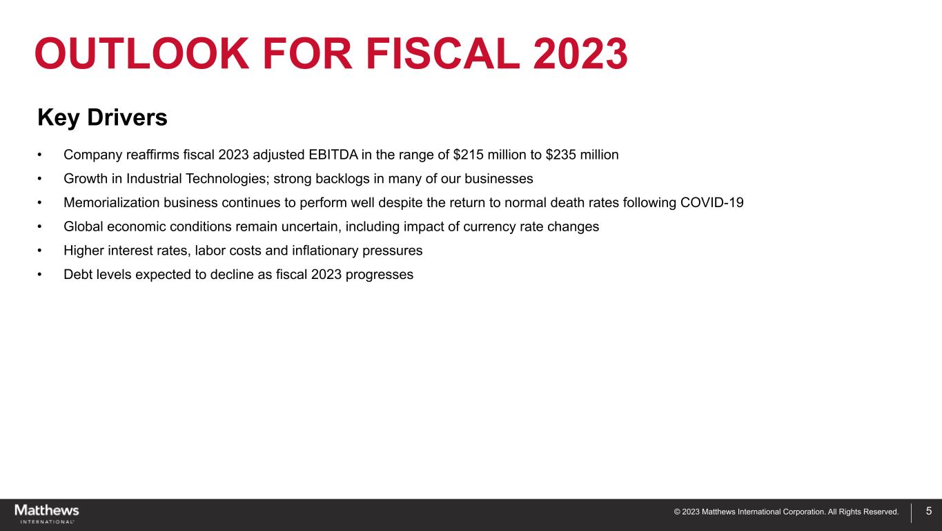 © 2023 Matthews International Corporation. All Rights Reserved. 4 SGK BRAND SOLUTIONS MEMORIALIZATION INDUSTRIAL TECHNOLOGIES • Improved pricing and growth in sales of cemetery memorial products and mausoleums • U.S. death rates have substantially normalized from higher pandemic levels • Challenged by unfavorable currency and weakened economic conditions in Europe • Cost reduction initiatives expected to produce improved margins • Continued high growth in energy storage solutions business • Increased interest in our energy storage solutions offerings • New product development progressing BUSINESS UPDATE