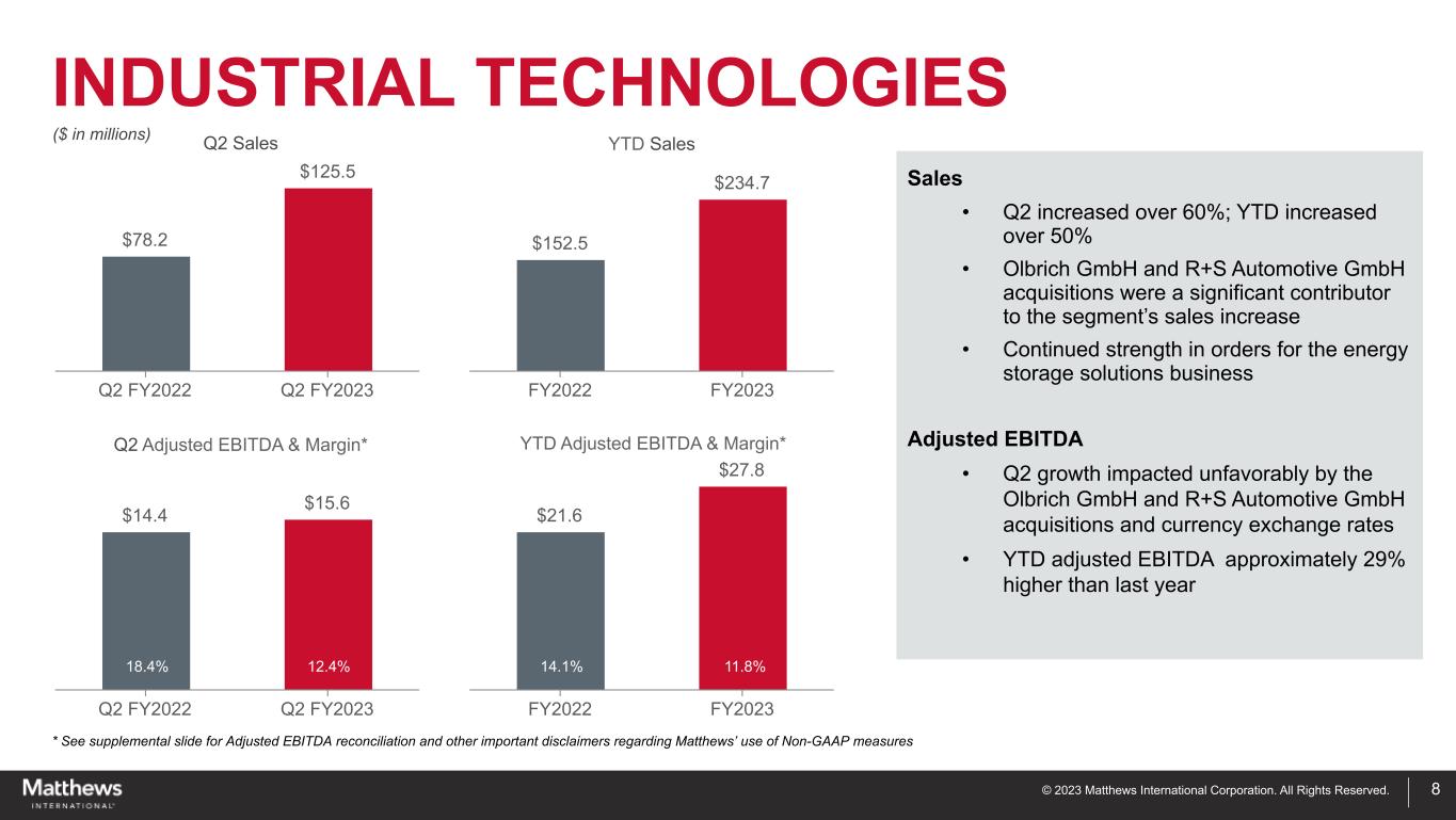 © 2023 Matthews International Corporation. All Rights Reserved. Q2 2023 SUMMARY 7 Q2 2022 Q2 2023 Sales $ 445.0 $ 479.6 Diluted (L)EPS $ (0.06) $ 0.29 Non-GAAP Adjusted EPS* $ 0.74 $ 0.65 Net (Loss) Income Attributable to Matthews $ (1.9) $ 9.1 Adjusted EBITDA* $ 55.2 $ 58.4 ($ in millions except per-share amounts) Q2 YTD YTD 2022 YTD 2023 Sales $ 883.6 $ 928.8 Diluted (L)EPS $ (0.68) $ 0.41 Non-GAAP Adjusted EPS* $ 1.48 $ 1.18 Net (Loss) Income Attributable to Matthews $ (21.7) $ 12.8 Adjusted EBITDA* $ 108.5 $ 107.7 2nd Quarter ("Q2") Highlights Sales • Industrial Technologies sales over 60% higher • Memorialization sales growth GAAP EPS • Prior second quarter included asset write-downs related to the Russia-Ukraine conflict Adjusted EBITDA • Increased consolidated sales • European market conditions, including currency impacts Adjusted EPS • Higher adjusted EBITDA • Higher interest expense Year-to-Date ("YTD") Highlights • Consolidated sales 5.1% higher than last year • Unfavorable impacts due to currency exchange rates • Significant material (commodity) and other inflationary cost increases and higher labor costs * See supplemental slides for Adjusted EPS and Adjusted EBITDA reconciliations and other important disclaimers regarding Matthews’ use of Non-GAAP measures