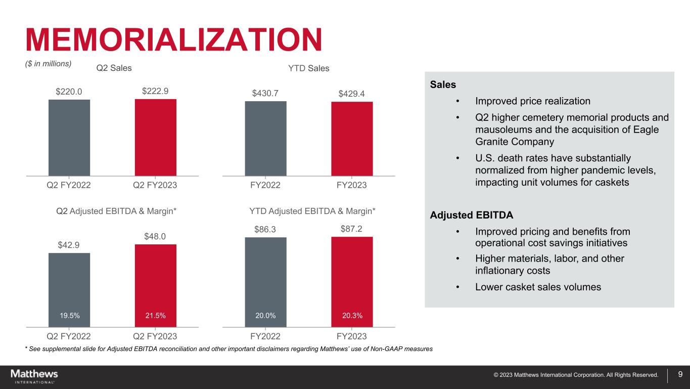 © 2023 Matthews International Corporation. All Rights Reserved. INDUSTRIAL TECHNOLOGIES 8 15.5% 12.4% 15.6%10.3% ($ in millions) $78.2 $125.5 Q2 FY2022 Q2 FY2023 $152.5 $234.7 FY2022 FY2023 $14.4 $15.6 Q2 FY2022 Q2 FY2023 $21.6 $27.8 FY2022 FY2023 18.4% 12.4% 14.1% 11.8% Q2 Sales Q2 Adjusted EBITDA & Margin* YTD Sales YTD Adjusted EBITDA & Margin* Sales • Q2 increased over 60%; YTD increased over 50% • Olbrich GmbH and R+S Automotive GmbH acquisitions were a significant contributor to the segment’s sales increase • Continued strength in orders for the energy storage solutions business Adjusted EBITDA • Q2 growth impacted unfavorably by the Olbrich GmbH and R+S Automotive GmbH acquisitions and currency exchange rates • YTD adjusted EBITDA approximately 29% higher than last year * See supplemental slide for Adjusted EBITDA reconciliation and other important disclaimers regarding Matthews’ use of Non-GAAP measures
