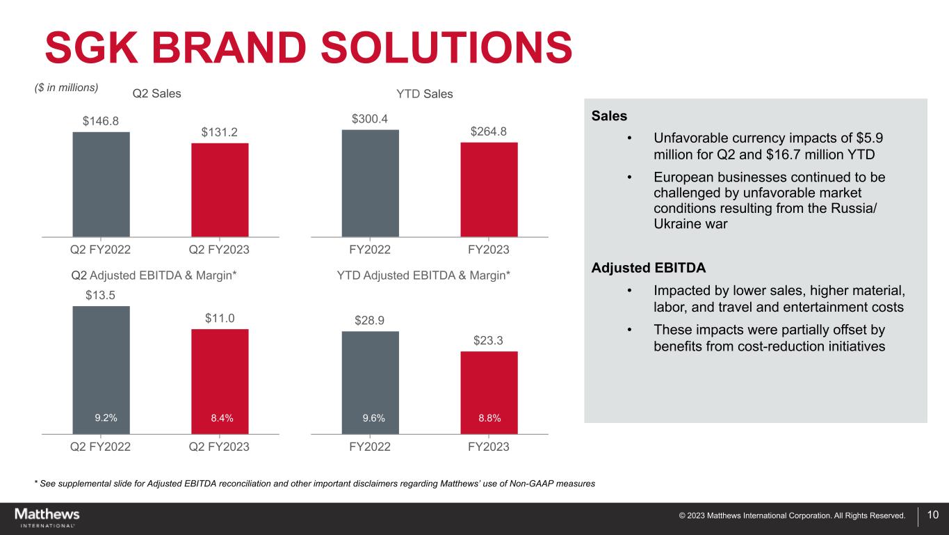 © 2023 Matthews International Corporation. All Rights Reserved. MEMORIALIZATION 9 23.0% 21.1% $220.0 $222.9 Q2 FY2022 Q2 FY2023 $430.7 $429.4 FY2022 FY2023 $42.9 $48.0 Q2 FY2022 Q2 FY2023 $86.3 $87.2 FY2022 FY2023 19.5% 21.5% 20.0% 20.3% ($ in millions) Q2 Sales Q2 Adjusted EBITDA & Margin* YTD Sales YTD Adjusted EBITDA & Margin* Sales • Improved price realization • Q2 higher cemetery memorial products and mausoleums and the acquisition of Eagle Granite Company • U.S. death rates have substantially normalized from higher pandemic levels, impacting unit volumes for caskets Adjusted EBITDA • Improved pricing and benefits from operational cost savings initiatives • Higher materials, labor, and other inflationary costs • Lower casket sales volumes * See supplemental slide for Adjusted EBITDA reconciliation and other important disclaimers regarding Matthews’ use of Non-GAAP measures