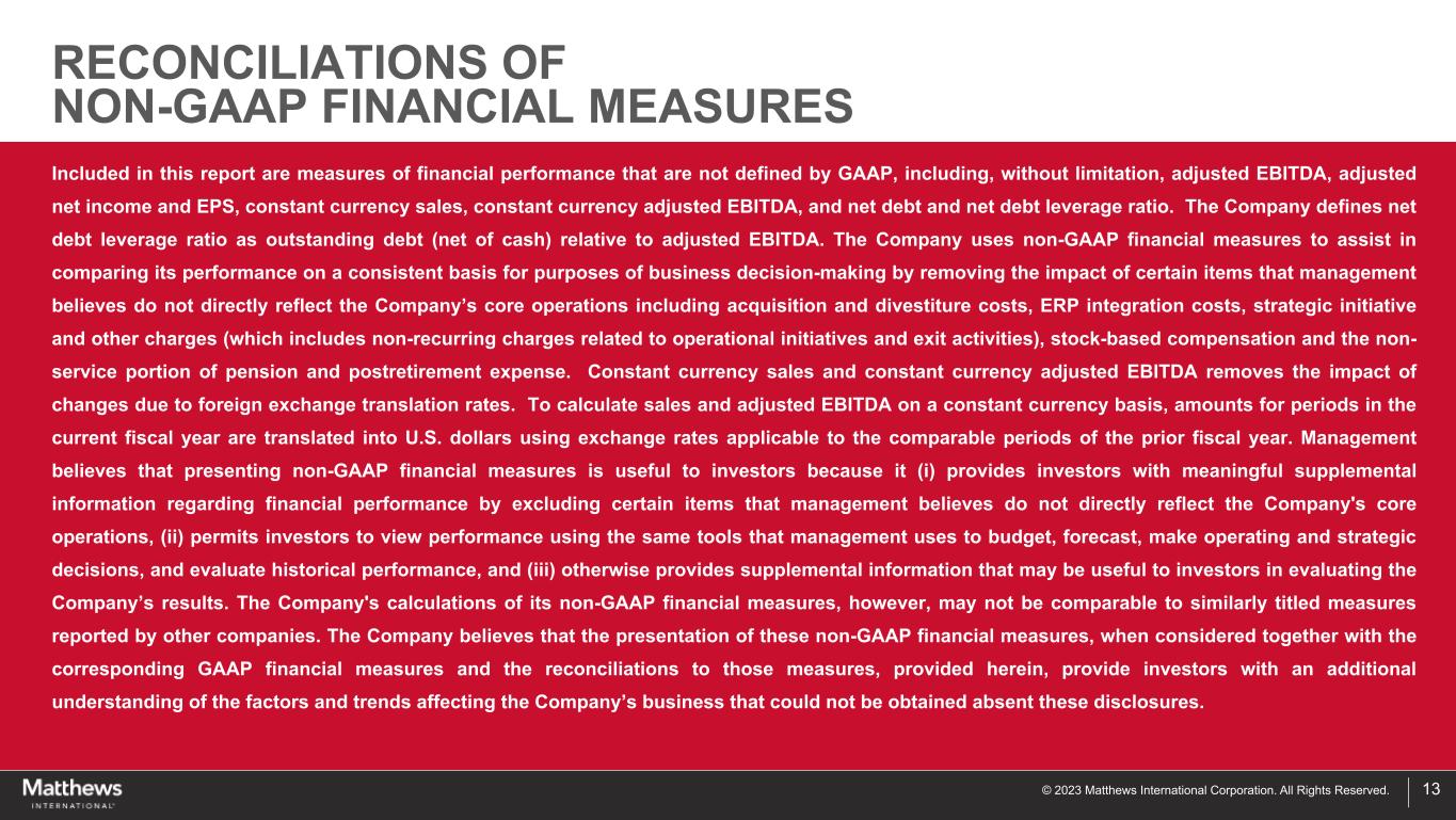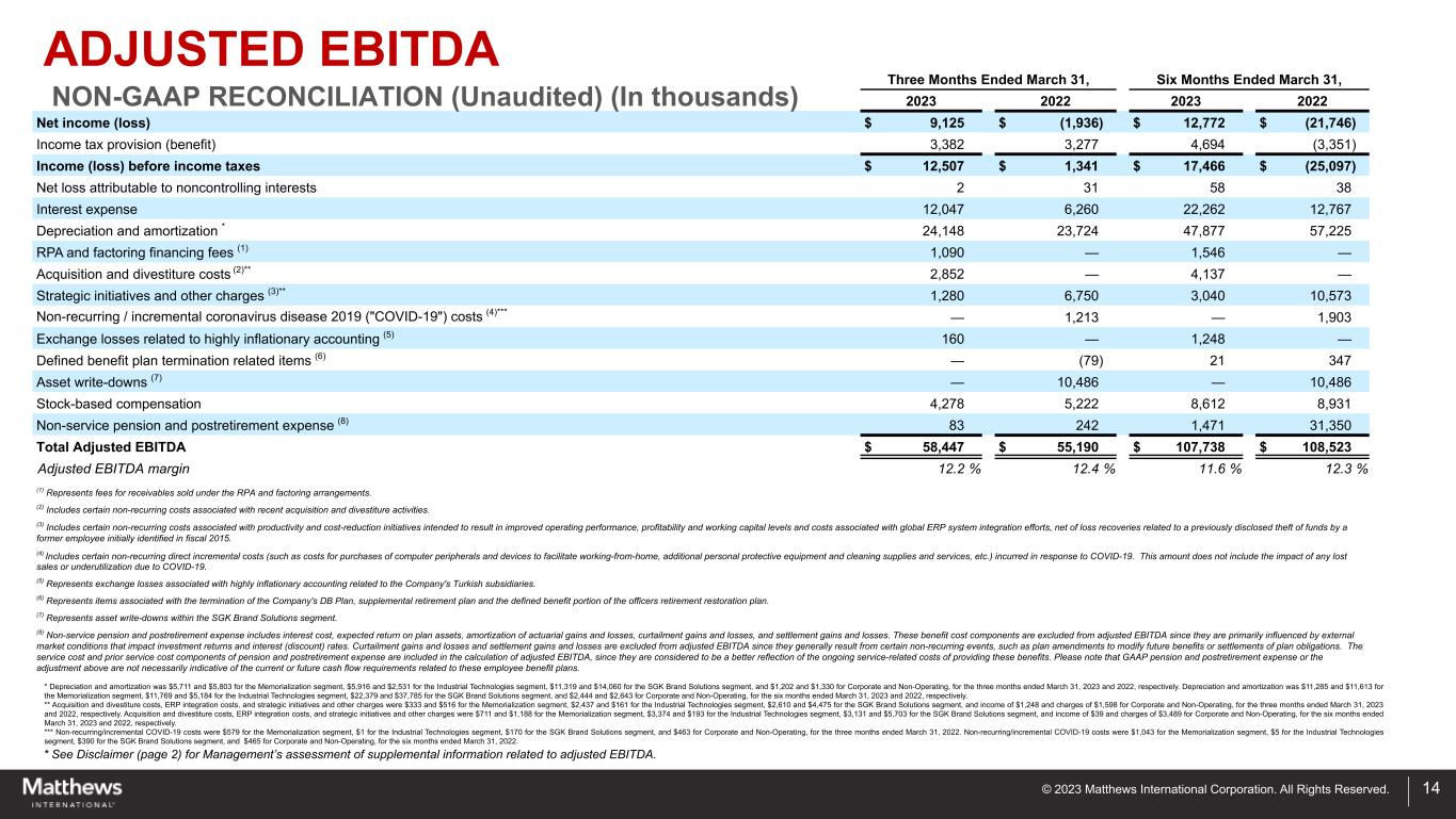 © 2023 Matthews International Corporation. All Rights Reserved. 13 Included in this report are measures of financial performance that are not defined by GAAP, including, without limitation, adjusted EBITDA, adjusted net income and EPS, constant currency sales, constant currency adjusted EBITDA, and net debt and net debt leverage ratio. The Company defines net debt leverage ratio as outstanding debt (net of cash) relative to adjusted EBITDA. The Company uses non-GAAP financial measures to assist in comparing its performance on a consistent basis for purposes of business decision-making by removing the impact of certain items that management believes do not directly reflect the Company’s core operations including acquisition and divestiture costs, ERP integration costs, strategic initiative and other charges (which includes non-recurring charges related to operational initiatives and exit activities), stock-based compensation and the non- service portion of pension and postretirement expense. Constant currency sales and constant currency adjusted EBITDA removes the impact of changes due to foreign exchange translation rates. To calculate sales and adjusted EBITDA on a constant currency basis, amounts for periods in the current fiscal year are translated into U.S. dollars using exchange rates applicable to the comparable periods of the prior fiscal year. Management believes that presenting non-GAAP financial measures is useful to investors because it (i) provides investors with meaningful supplemental information regarding financial performance by excluding certain items that management believes do not directly reflect the Company's core operations, (ii) permits investors to view performance using the same tools that management uses to budget, forecast, make operating and strategic decisions, and evaluate historical performance, and (iii) otherwise provides supplemental information that may be useful to investors in evaluating the Company’s results. The Company's calculations of its non-GAAP financial measures, however, may not be comparable to similarly titled measures reported by other companies. The Company believes that the presentation of these non-GAAP financial measures, when considered together with the corresponding GAAP financial measures and the reconciliations to those measures, provided herein, provide investors with an additional understanding of the factors and trends affecting the Company’s business that could not be obtained absent these disclosures. RECONCILIATIONS OF NON-GAAP FINANCIAL MEASURES