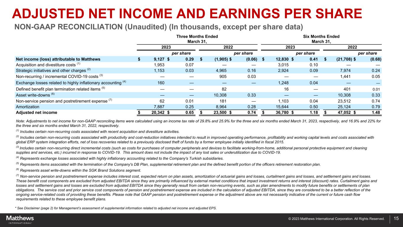 © 2023 Matthews International Corporation. All Rights Reserved. * See Disclaimer (page 2) for Management’s assessment of supplemental information related to adjusted EBITDA. 14 Three Months Ended March 31, Six Months Ended March 31, 2023 2022 2023 2022 Net income (loss) $ 9,125 $ (1,936) $ 12,772 $ (21,746) Income tax provision (benefit) 3,382 3,277 4,694 (3,351) Income (loss) before income taxes $ 12,507 $ 1,341 $ 17,466 $ (25,097) Net loss attributable to noncontrolling interests 2 31 58 38 Interest expense 12,047 6,260 22,262 12,767 Depreciation and amortization * 24,148 23,724 47,877 57,225 RPA and factoring financing fees (1) 1,090 — 1,546 — Acquisition and divestiture costs (2)** 2,852 — 4,137 — Strategic initiatives and other charges (3)** 1,280 6,750 3,040 10,573 Non-recurring / incremental coronavirus disease 2019 ("COVID-19") costs (4)*** — 1,213 — 1,903 Exchange losses related to highly inflationary accounting (5) 160 — 1,248 — Defined benefit plan termination related items (6) — (79) 21 347 Asset write-downs (7) — 10,486 — 10,486 Stock-based compensation 4,278 5,222 8,612 8,931 Non-service pension and postretirement expense (8) 83 242 1,471 31,350 Total Adjusted EBITDA $ 58,447 $ 55,190 $ 107,738 $ 108,523 Adjusted EBITDA margin 12.2 % 12.4 % 11.6 % 12.3 % (1) Represents fees for receivables sold under the RPA and factoring arrangements. (2) Includes certain non-recurring costs associated with recent acquisition and divestiture activities. (3) Includes certain non-recurring costs associated with productivity and cost-reduction initiatives intended to result in improved operating performance, profitability and working capital levels and costs associated with global ERP system integration efforts, net of loss recoveries related to a previously disclosed theft of funds by a former employee initially identified in fiscal 2015. (4) Includes certain non-recurring direct incremental costs (such as costs for purchases of computer peripherals and devices to facilitate working-from-home, additional personal protective equipment and cleaning supplies and services, etc.) incurred in response to COVID-19. This amount does not include the impact of any lost sales or underutilization due to COVID-19. (5) Represents exchange losses associated with highly inflationary accounting related to the Company's Turkish subsidiaries. (6) Represents items associated with the termination of the Company's DB Plan, supplemental retirement plan and the defined benefit portion of the officers retirement restoration plan. (7) Represents asset write-downs within the SGK Brand Solutions segment. (8) Non-service pension and postretirement expense includes interest cost, expected return on plan assets, amortization of actuarial gains and losses, curtailment gains and losses, and settlement gains and losses. These benefit cost components are excluded from adjusted EBITDA since they are primarily influenced by external market conditions that impact investment returns and interest (discount) rates. Curtailment gains and losses and settlement gains and losses are excluded from adjusted EBITDA since they generally result from certain non-recurring events, such as plan amendments to modify future benefits or settlements of plan obligations. The service cost and prior service cost components of pension and postretirement expense are included in the calculation of adjusted EBITDA, since they are considered to be a better reflection of the ongoing service-related costs of providing these benefits. Please note that GAAP pension and postretirement expense or the adjustment above are not necessarily indicative of the current or future cash flow requirements related to these employee benefit plans. * Depreciation and amortization was $5,711 and $5,803 for the Memorialization segment, $5,916 and $2,531 for the Industrial Technologies segment, $11,319 and $14,060 for the SGK Brand Solutions segment, and $1,202 and $1,330 for Corporate and Non-Operating, for the three months ended March 31, 2023 and 2022, respectively. Depreciation and amortization was $11,285 and $11,613 for the Memorialization segment, $11,769 and $5,184 for the Industrial Technologies segment, $22,379 and $37,785 for the SGK Brand Solutions segment, and $2,444 and $2,643 for Corporate and Non-Operating, for the six months ended March 31, 2023 and 2022, respectively. ** Acquisition and divestiture costs, ERP integration costs, and strategic initiatives and other charges were $333 and $516 for the Memorialization segment, $2,437 and $161 for the Industrial Technologies segment, $2,610 and $4,475 for the SGK Brand Solutions segment, and income of $1,248 and charges of $1,598 for Corporate and Non-Operating, for the three months ended March 31, 2023 and 2022, respectively. Acquisition and divestiture costs, ERP integration costs, and strategic initiatives and other charges were $711 and $1,188 for the Memorialization segment, $3,374 and $193 for the Industrial Technologies segment, $3,131 and $5,703 for the SGK Brand Solutions segment, and income of $39 and charges of $3,489 for Corporate and Non-Operating, for the six months ended March 31, 2023 and 2022, respectively. *** Non-recurring/incremental COVID-19 costs were $579 for the Memorialization segment, $1 for the Industrial Technologies segment, $170 for the SGK Brand Solutions segment, and $463 for Corporate and Non-Operating, for the three months ended March 31, 2022. Non-recurring/incremental COVID-19 costs were $1,043 for the Memorialization segment, $5 for the Industrial Technologies segment, $390 for the SGK Brand Solutions segment, and $465 for Corporate and Non-Operating, for the six months ended March 31, 2022. ADJUSTED EBITDA NON-GAAP RECONCILIATION (Unaudited) (In thousands)