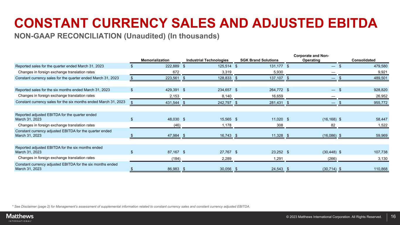 © 2023 Matthews International Corporation. All Rights Reserved. ADJUSTED NET INCOME AND EARNINGS PER SHARE NON-GAAP RECONCILIATION (Unaudited) (In thousands, except per share data) * See Disclaimer (page 2) for Management’s assessment of supplemental information related to adjusted net income and adjusted EPS. 15 Three Months Ended March 31, Six Months Ended March 31, 2023 2022 2023 2022 per share per share per share per share Net income (loss) attributable to Matthews $ 9,127 $ 0.29 $ (1,905) $ (0.06) $ 12,830 $ 0.41 $ (21,708) $ (0.68) Acquisition and divestiture costs (1) 1,953 0.07 — — 3,015 0.10 — — Strategic initiatives and other charges (2) 1,153 0.03 4,965 0.16 2,924 0.09 7,974 0.24 Non-recurring / incremental COVID-19 costs (3) — — 905 0.03 — — 1,441 0.05 Exchange losses related to highly inflationary accounting (4) 160 — — — 1,248 0.04 — — Defined benefit plan termination related items (5) — — 82 16 — 401 0.01 Asset write-downs (6) — — 10,308 0.33 — — 10,308 0.33 Non-service pension and postretirement expense (7) 62 0.01 181 — 1,103 0.04 23,512 0.74 Amortization 7,887 0.25 8,964 0.28 15,644 0.50 25,124 0.79 Adjusted net income $ 20,342 $ 0.65 $ 23,500 $ 0.74 $ 36,780 $ 1.18 $ 47,052 $ 1.48 Note: Adjustments to net income for non-GAAP reconciling items were calculated using an income tax rate of 29.8% and 25.9% for the three and six months ended March 31, 2023, respectively, and 16.9% and 22% for the three and six months ended March 31, 2022, respectively. (1) Includes certain non-recurring costs associated with recent acquisition and divestiture activities. (2) Includes certain non-recurring costs associated with productivity and cost-reduction initiatives intended to result in improved operating performance, profitability and working capital levels and costs associated with global ERP system integration efforts, net of loss recoveries related to a previously disclosed theft of funds by a former employee initially identified in fiscal 2015. (3) Includes certain non-recurring direct incremental costs (such as costs for purchases of computer peripherals and devices to facilitate working-from-home, additional personal protective equipment and cleaning supplies and services, etc.) incurred in response to COVID-19. This amount does not include the impact of any lost sales or underutilization due to COVID-19. (4) Represents exchange losses associated with highly inflationary accounting related to the Company's Turkish subsidiaries. (5) Represents items associated with the termination of the Company's DB Plan, supplemental retirement plan and the defined benefit portion of the officers retirement restoration plan. (6) Represents asset write-downs within the SGK Brand Solutions segment. (7) Non-service pension and postretirement expense includes interest cost, expected return on plan assets, amortization of actuarial gains and losses, curtailment gains and losses, and settlement gains and losses. These benefit cost components are excluded from adjusted EBITDA since they are primarily influenced by external market conditions that impact investment returns and interest (discount) rates. Curtailment gains and losses and settlement gains and losses are excluded from adjusted EBITDA since they generally result from certain non-recurring events, such as plan amendments to modify future benefits or settlements of plan obligations. The service cost and prior service cost components of pension and postretirement expense are included in the calculation of adjusted EBITDA, since they are considered to be a better reflection of the ongoing service-related costs of providing these benefits. Please note that GAAP pension and postretirement expense or the adjustment above are not necessarily indicative of the current or future cash flow requirements related to these employee benefit plans.