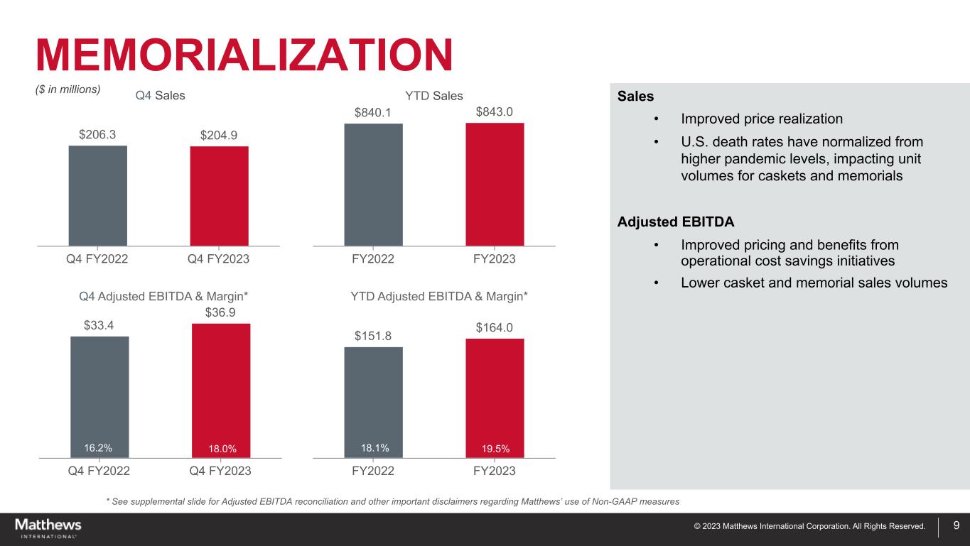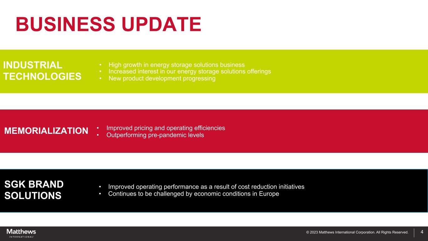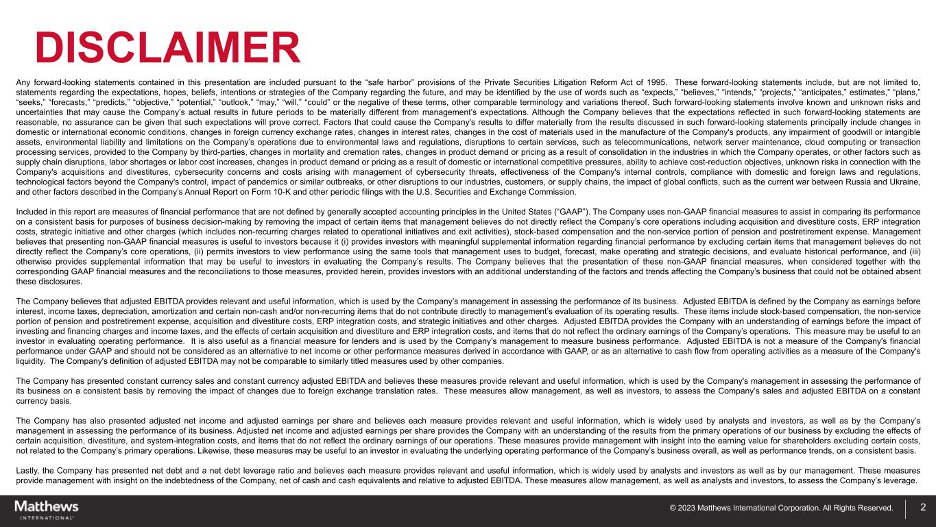 © 2023 Matthews International Corporation. All Rights Reserved. DISCLAIMER 2 Any forward-looking statements contained in this presentation are included pursuant to the “safe harbor” provisions of the Private Securities Litigation Reform Act of 1995. These forward-looking statements include, but are not limited to, statements regarding the expectations, hopes, beliefs, intentions or strategies of the Company regarding the future, and may be identified by the use of words such as “expects,” “believes,” “intends,” “projects,” “anticipates,” estimates,” “plans,” “seeks,” “forecasts,” “predicts,” “objective,” “potential,” “outlook,” “may,” “will,” “could” or the negative of these terms, other comparable terminology and variations thereof. Such forward-looking statements involve known and unknown risks and uncertainties that may cause the Company’s actual results in future periods to be materially different from management’s expectations. Although the Company believes that the expectations reflected in such forward-looking statements are reasonable, no assurance can be given that such expectations will prove correct. Factors that could cause the Company's results to differ materially from the results discussed in such forward-looking statements principally include changes in domestic or international economic conditions, changes in foreign currency exchange rates, changes in interest rates, changes in the cost of materials used in the manufacture of the Company's products, any impairment of goodwill or intangible assets, environmental liability and limitations on the Company’s operations due to environmental laws and regulations, disruptions to certain services, such as telecommunications, network server maintenance, cloud computing or transaction processing services, provided to the Company by third-parties, changes in mortality and cremation rates, changes in product demand or pricing as a result of consolidation in the industries in which the Company operates, or other factors such as supply chain disruptions, labor shortages or labor cost increases, changes in product demand or pricing as a result of domestic or international competitive pressures, ability to achieve cost-reduction objectives, unknown risks in connection with the Company's acquisitions and divestitures, cybersecurity concerns and costs arising with management of cybersecurity threats, effectiveness of the Company's internal controls, compliance with domestic and foreign laws and regulations, technological factors beyond the Company's control, impact of pandemics or similar outbreaks, or other disruptions to our industries, customers, or supply chains, the impact of global conflicts, such as the current war between Russia and Ukraine, and other factors described in the Company’s Annual Report on Form 10-K and other periodic filings with the U.S. Securities and Exchange Commission. Included in this report are measures of financial performance that are not defined by generally accepted accounting principles in the United States (“GAAP”). The Company uses non-GAAP financial measures to assist in comparing its performance on a consistent basis for purposes of business decision-making by removing the impact of certain items that management believes do not directly reflect the Company’s core operations including acquisition and divestiture costs, ERP integration costs, strategic initiative and other charges (which includes non-recurring charges related to operational initiatives and exit activities), stock-based compensation and the non-service portion of pension and postretirement expense. Management believes that presenting non-GAAP financial measures is useful to investors because it (i) provides investors with meaningful supplemental information regarding financial performance by excluding certain items that management believes do not directly reflect the Company’s core operations, (ii) permits investors to view performance using the same tools that management uses to budget, forecast, make operating and strategic decisions, and evaluate historical performance, and (iii) otherwise provides supplemental information that may be useful to investors in evaluating the Company’s results. The Company believes that the presentation of these non-GAAP financial measures, when considered together with the corresponding GAAP financial measures and the reconciliations to those measures, provided herein, provides investors with an additional understanding of the factors and trends affecting the Company’s business that could not be obtained absent these disclosures. The Company believes that adjusted EBITDA provides relevant and useful information, which is used by the Company’s management in assessing the performance of its business. Adjusted EBITDA is defined by the Company as earnings before interest, income taxes, depreciation, amortization and certain non-cash and/or non-recurring items that do not contribute directly to management’s evaluation of its operating results. These items include stock-based compensation, the non-service portion of pension and postretirement expense, acquisition and divestiture costs, ERP integration costs, and strategic initiatives and other charges. Adjusted EBITDA provides the Company with an understanding of earnings before the impact of investing and financing charges and income taxes, and the effects of certain acquisition and divestiture and ERP integration costs, and items that do not reflect the ordinary earnings of the Company’s operations. This measure may be useful to an investor in evaluating operating performance. It is also useful as a financial measure for lenders and is used by the Company’s management to measure business performance. Adjusted EBITDA is not a measure of the Company's financial performance under GAAP and should not be considered as an alternative to net income or other performance me