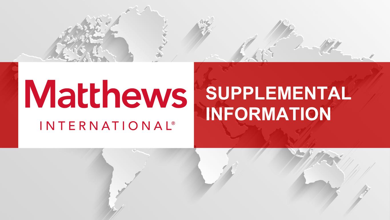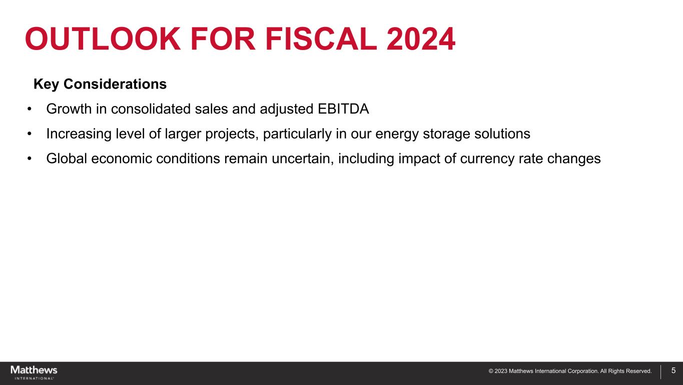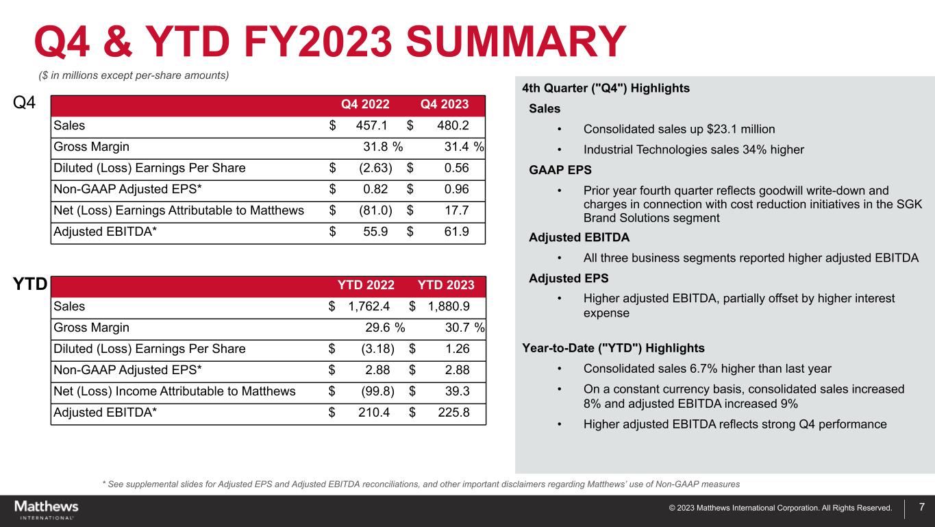 © 2023 Matthews International Corporation. All Rights Reserved. DISCLAIMER 2 Any forward-looking statements contained in this presentation are included pursuant to the “safe harbor” provisions of the Private Securities Litigation Reform Act of 1995. These forward-looking statements include, but are not limited to, statements regarding the expectations, hopes, beliefs, intentions or strategies of the Company regarding the future, and may be identified by the use of words such as “expects,” “believes,” “intends,” “projects,” “anticipates,” estimates,” “plans,” “seeks,” “forecasts,” “predicts,” “objective,” “potential,” “outlook,” “may,” “will,” “could” or the negative of these terms, other comparable terminology and variations thereof. Such forward-looking statements involve known and unknown risks and uncertainties that may cause the Company’s actual results in future periods to be materially different from management’s expectations. Although the Company believes that the expectations reflected in such forward-looking statements are reasonable, no assurance can be given that such expectations will prove correct. Factors that could cause the Company's results to differ materially from the results discussed in such forward-looking statements principally include changes in domestic or international economic conditions, changes in foreign currency exchange rates, changes in interest rates, changes in the cost of materials used in the manufacture of the Company's products, any impairment of goodwill or intangible assets, environmental liability and limitations on the Company’s operations due to environmental laws and regulations, disruptions to certain services, such as telecommunications, network server maintenance, cloud computing or transaction processing services, provided to the Company by third-parties, changes in mortality and cremation rates, changes in product demand or pricing as a result of consolidation in the industries in which the Company operates, or other factors such as supply chain disruptions, labor shortages or labor cost increases, changes in product demand or pricing as a result of domestic or international competitive pressures, ability to achieve cost-reduction objectives, unknown risks in connection with the Company's acquisitions and divestitures, cybersecurity concerns and costs arising with management of cybersecurity threats, effectiveness of the Company's internal controls, compliance with domestic and foreign laws and regulations, technological factors beyond the Company's control, impact of pandemics or similar outbreaks, or other disruptions to our industries, customers, or supply chains, the impact of global conflicts, such as the current war between Russia and Ukraine, and other factors described in the Company’s Annual Report on Form 10-K and other periodic filings with the U.S. Securities and Exchange Commission. Included in this report are measures of financial performance that are not defined by generally accepted accounting principles in the United States (“GAAP”). The Company uses non-GAAP financial measures to assist in comparing its performance on a consistent basis for purposes of business decision-making by removing the impact of certain items that management believes do not directly reflect the Company’s core operations including acquisition and divestiture costs, ERP integration costs, strategic initiative and other charges (which includes non-recurring charges related to operational initiatives and exit activities), stock-based compensation and the non-service portion of pension and postretirement expense. Management believes that presenting non-GAAP financial measures is useful to investors because it (i) provides investors with meaningful supplemental information regarding financial performance by excluding certain items that management believes do not directly reflect the Company’s core operations, (ii) permits investors to view performance using the same tools that management uses to budget, forecast, make operating and strategic decisions, and evaluate historical performance, and (iii) otherwise provides supplemental information that may be useful to investors in evaluating the Company’s results. The Company believes that the presentation of these non-GAAP financial measures, when considered together with the corresponding GAAP financial measures and the reconciliations to those measures, provided herein, provides investors with an additional understanding of the factors and trends affecting the Company’s business that could not be obtained absent these disclosures. The Company believes that adjusted EBITDA provides relevant and useful information, which is used by the Company’s management in assessing the performance of its business. Adjusted EBITDA is defined by the Company as earnings before interest, income taxes, depreciation, amortization and certain non-cash and/or non-recurring items that do not contribute directly to management’s evaluation of its operating results. These items include stock-based compensation, the non-service portion of pension and postretirement expense, acquisition and divestiture costs, ERP integration costs, and strategic initiatives and other charges. Adjusted EBITDA provides the Company with an understanding of earnings before the impact of investing and financing charges and income taxes, and the effects of certain acquisition and divestiture and ERP integration costs, and items that do not reflect the ordinary earnings of the Company’s operations. This measure may be useful to an investor in evaluating operating performance. It is also useful as a financial measure for lenders and is used by the Company’s management to measure business performance. Adjusted EBITDA is not a measure of the Company's financial performance under GAAP and should not be considered as an alternative to net income or other performance me