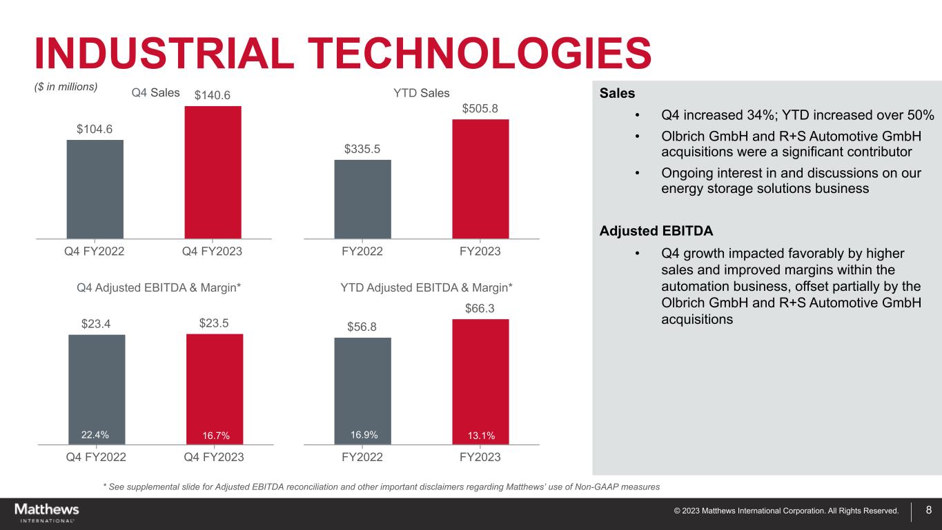 © 2023 Matthews International Corporation. All Rights Reserved. Q4 & YTD FY2023 SUMMARY * See supplemental slides for Adjusted EPS and Adjusted EBITDA reconciliations, and other important disclaimers regarding Matthews’ use of Non-GAAP measures 4th Quarter ("Q4") Highlights Sales • Consolidated sales up $23.1 million • Industrial Technologies sales 34% higher GAAP EPS • Prior year fourth quarter reflects goodwill write-down and charges in connection with cost reduction initiatives in the SGK Brand Solutions segment Adjusted EBITDA • All three business segments reported higher adjusted EBITDA Adjusted EPS • Higher adjusted EBITDA, partially offset by higher interest expense Year-to-Date ("YTD") Highlights • Consolidated sales 6.7% higher than last year • On a constant currency basis, consolidated sales increased 8% and adjusted EBITDA increased 9% • Higher adjusted EBITDA reflects strong Q4 performance 7 Q4 2022 Q4 2023 Sales $ 457.1 $ 480.2 Gross Margin 31.8 % 31.4 % Diluted (Loss) Earnings Per Share $ (2.63) $ 0.56 Non-GAAP Adjusted EPS* $ 0.82 $ 0.96 Net (Loss) Earnings Attributable to Matthews $ (81.0) $ 17.7 Adjusted EBITDA* $ 55.9 $ 61.9 ($ in millions except per-share amounts) Q4 YTD YTD 2022 YTD 2023 Sales $ 1,762.4 $ 1,880.9 Gross Margin 29.6 % 30.7 % Diluted (Loss) Earnings Per Share $ (3.18) $ 1.26 Non-GAAP Adjusted EPS* $ 2.88 $ 2.88 Net (Loss) Income Attributable to Matthews $ (99.8) $ 39.3 Adjusted EBITDA* $ 210.4 $ 225.8