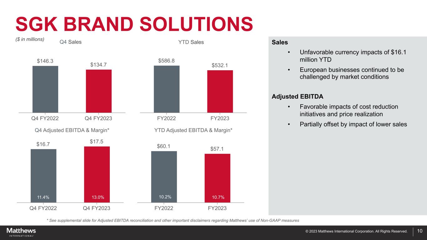 © 2023 Matthews International Corporation. All Rights Reserved. MEMORIALIZATION * See supplemental slide for Adjusted EBITDA reconciliation and other important disclaimers regarding Matthews’ use of Non-GAAP measures 9 23.0% 21.1% $206.3 $204.9 Q4 FY2022 Q4 FY2023 $840.1 $843.0 FY2022 FY2023 $33.4 $36.9 Q4 FY2022 Q4 FY2023 $151.8 $164.0 FY2022 FY2023 Sales • Improved price realization • U.S. death rates have normalized from higher pandemic levels, impacting unit volumes for caskets and memorials Adjusted EBITDA • Improved pricing and benefits from operational cost savings initiatives • Lower casket and memorial sales volumes 16.2% 18.0% 18.1% 19.5% ($ in millions) Q4 Sales Q4 Adjusted EBITDA & Margin* YTD Sales YTD Adjusted EBITDA & Margin*