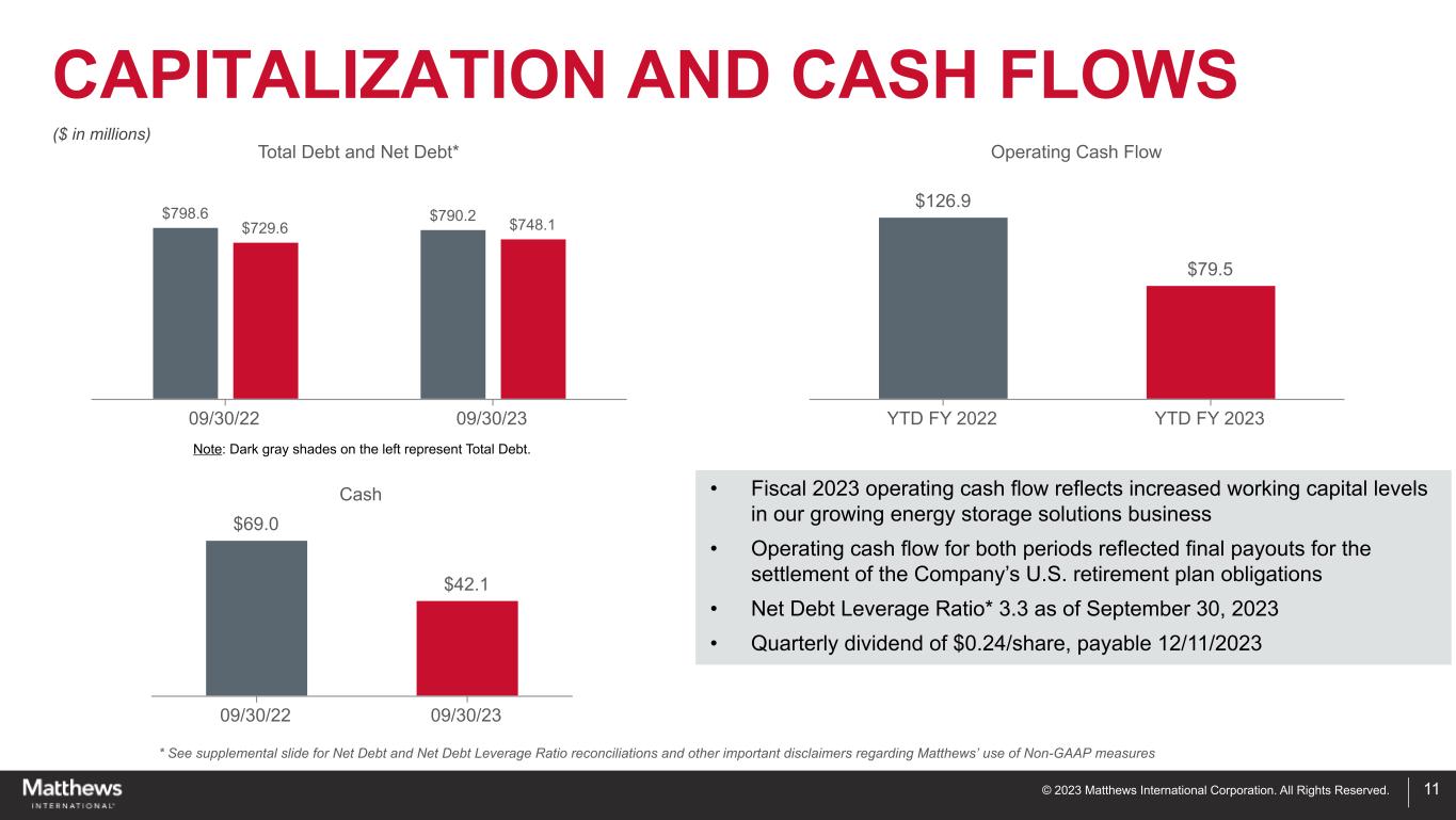© 2023 Matthews International Corporation. All Rights Reserved. SGK BRAND SOLUTIONS Sales • Unfavorable currency impacts of $16.1 million YTD • European businesses continued to be challenged by market conditions Adjusted EBITDA • Favorable impacts of cost reduction initiatives and price realization • Partially offset by impact of lower sales ($ in millions) * See supplemental slide for Adjusted EBITDA reconciliation and other important disclaimers regarding Matthews’ use of Non-GAAP measures 10 15.4% 12.9% $146.3 $134.7 Q4 FY2022 Q4 FY2023 $586.8 $532.1 FY2022 FY2023 $16.7 $17.5 Q4 FY2022 Q4 FY2023 $60.1 $57.1 FY2022 FY2023 13.0%11.4% 10.2% 10.7% Q4 Sales Q4 Adjusted EBITDA & Margin* YTD Sales YTD Adjusted EBITDA & Margin*