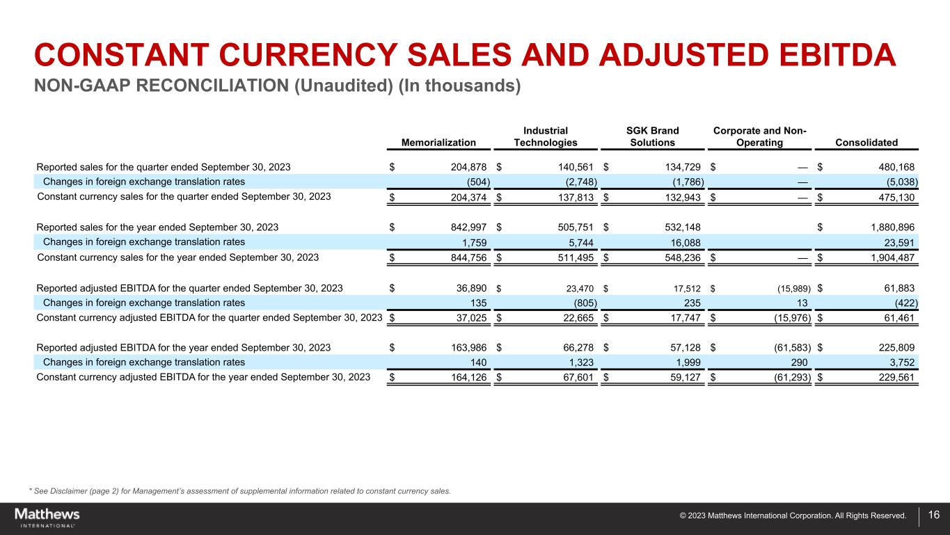 © 2023 Matthews International Corporation. All Rights Reserved. ADJUSTED NET INCOME AND EARNINGS PER SHARE NON-GAAP RECONCILIATION (Unaudited) (In thousands, except per share data) * See Disclaimer (page 2) for Management’s assessment of supplemental information related to adjusted net income and adjusted EPS. 15 Three Months Ended September 30, Year Ended September 30, 2023 2022 2023 2022 per share per share per share per share Net income (loss) attributable to Matthews $ 17,723 $ 0.56 $ (80,959) $ (2.63) $ 39,291 $ 1.26 $ (99,774) $ (3.18) Acquisition and divestiture items (1) 1,626 0.05 5,581 0.18 4,874 0.15 6,319 0.20 Strategic initiatives and other charges (2) 4,053 0.13 12,736 0.41 11,106 0.36 26,092 0.84 Highly inflationary accounting impacts (primarily non-cash) (3) (1,714) (0.05) 228 0.01 1,360 0.04 1,473 0.05 Defined benefit plan termination related items (4) 649 0.02 (537) (0.02) 665 0.02 (182) (0.01) Asset write-downs, net (5) — — 38 — — — 9,993 0.32 Goodwill write-downs (6) * — — 79,762 2.59 — — 79,762 2.54 Non-service pension and postretirement expense (7) 63 — 50 — 1,230 0.04 23,867 0.76 Intangible amortization expense 7,927 0.25 8,655 0.28 31,551 1.01 42,813 1.36 Adjusted net income $ 30,327 $ 0.96 $ 25,554 $ 0.82 $ 90,077 $ 2.88 $ 90,363 $ 2.88 Note: Adjustments to net income for non-GAAP reconciling items were calculated using an income tax rate of 26.9% and 7.5%, for the three months ended September 30, 2023 and 2022, respectively, and 25.7% and 14.5% for the fiscal year ended September 30, 2023 and 2022, respectively. (1) Includes certain non-recurring costs associated with recent acquisition and divestiture activities, and also includes a gain in fiscal year 2023 related to the divestiture of a business in the Industrial Technologies segment. (2) Includes certain non-recurring costs associated with productivity and cost-reduction initiatives intended to result in improved operating performance, profitability and working capital levels and costs associated with global ERP system integration efforts, net of loss recoveries in fiscal year 2023 related to a previously disclosed theft of funds by a former employee initially identified in fiscal 2015. Also includes certain non-recurring direct incremental costs (such as costs for purchases of computer peripherals and devices to facilitate working-from-home, additional personal protective equipment and cleaning supplies and services, etc.) incurred in response to COVID-19. This amount does not include the impact of any lost sales or underutilization due to COVID-19. (3) Represents exchange gains and losses associated with highly inflationary accounting related to the Company's Turkish subsidiaries (4) Represents items associated with the termination of the Company's DB Plan, supplemental retirement plan and the defined benefit portion of the officers retirement restoration plan. (5) Represents asset write-downs, net of recoveries within the SGK Brand Solutions segment. (6) Represents goodwill write-downs within the SGK Brand Solutions segment. (7) Non-service pension and postretirement expense includes interest cost, expected return on plan assets, amortization of actuarial gains and losses, curtailment gains and losses, and settlement gains and losses. These benefit cost components are excluded from adjusted EBITDA since they are primarily influenced by external market conditions that impact investment returns and interest (discount) rates. Curtailment gains and losses and settlement gains and losses are excluded from adjusted EBITDA since they generally result from certain non-recurring events, such as plan amendments to modify future benefits or settlements of plan obligations. The service cost and prior service cost components of pension and postretirement expense are included in the calculation of adjusted EBITDA, since they are considered to be a better reflection of the ongoing service-related costs of providing these benefits. Please note that GAAP pension and postretirement expense or the adjustment above are not necessarily indicative of the current or future cash flow requirements related to these employee benefit plans. * Per share amounts based on the diluted shares for each respective period.