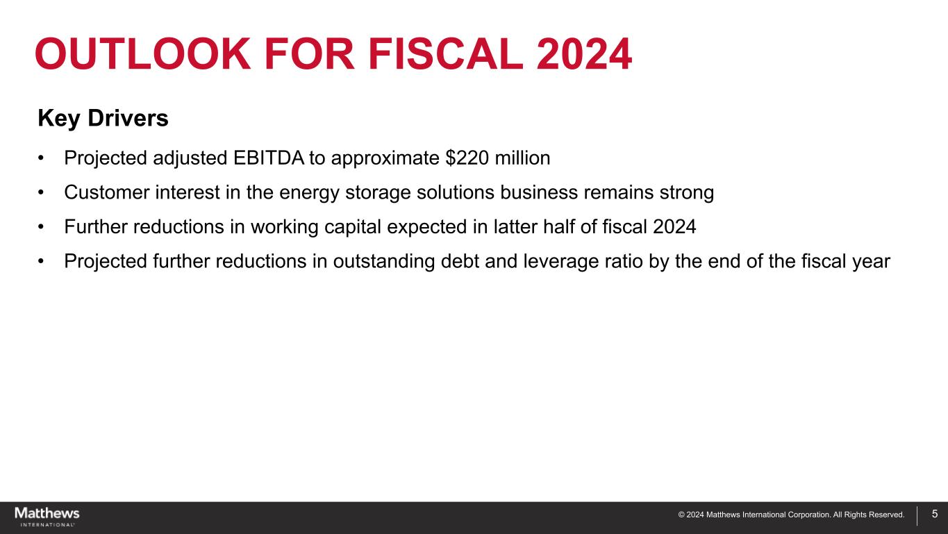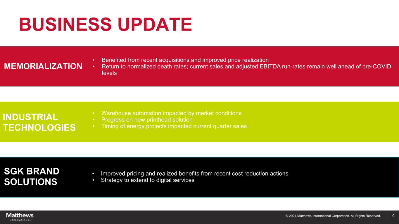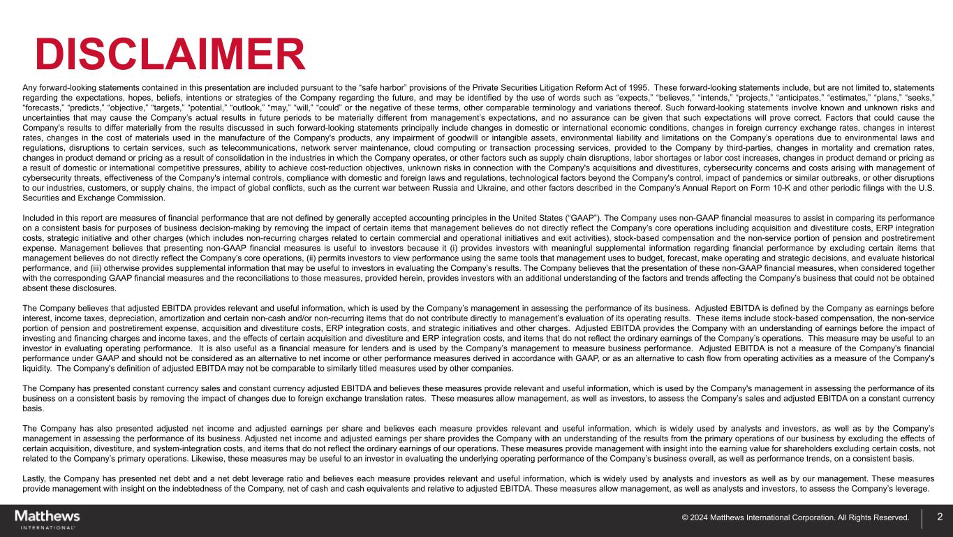 © 2024 Matthews International Corporation. All Rights Reserved. DISCLAIMER 2 Any forward-looking statements contained in this presentation are included pursuant to the “safe harbor” provisions of the Private Securities Litigation Reform Act of 1995. These forward-looking statements include, but are not limited to, statements regarding the expectations, hopes, beliefs, intentions or strategies of the Company regarding the future, and may be identified by the use of words such as “expects,” “believes,” “intends,” “projects,” “anticipates,” “estimates,” “plans,” “seeks,” “forecasts,” “predicts,” “objective,” “targets,” “potential,” “outlook,” “may,” “will,” “could” or the negative of these terms, other comparable terminology and variations thereof. Such forward-looking statements involve known and unknown risks and uncertainties that may cause the Company’s actual results in future periods to be materially different from management’s expectations, and no assurance can be given that such expectations will prove correct. Factors that could cause the Company's results to differ materially from the results discussed in such forward-looking statements principally include changes in domestic or international economic conditions, changes in foreign currency exchange rates, changes in interest rates, changes in the cost of materials used in the manufacture of the Company's products, any impairment of goodwill or intangible assets, environmental liability and limitations on the Company’s operations due to environmental laws and regulations, disruptions to certain services, such as telecommunications, network server maintenance, cloud computing or transaction processing services, provided to the Company by third-parties, changes in mortality and cremation rates, changes in product demand or pricing as a result of consolidation in the industries in which the Company operates, or other factors such as supply chain disruptions, labor shortages or labor cost increases, changes in product demand or pricing as a result of domestic or international competitive pressures, ability to achieve cost-reduction objectives, unknown risks in connection with the Company's acquisitions and divestitures, cybersecurity concerns and costs arising with management of cybersecurity threats, effectiveness of the Company's internal controls, compliance with domestic and foreign laws and regulations, technological factors beyond the Company's control, impact of pandemics or similar outbreaks, or other disruptions to our industries, customers, or supply chains, the impact of global conflicts, such as the current war between Russia and Ukraine, and other factors described in the Company’s Annual Report on Form 10-K and other periodic filings with the U.S. Securities and Exchange Commission. Included in this report are measures of financial performance that are not defined by generally accepted accounting principles in the United States (“GAAP”). The Company uses non-GAAP financial measures to assist in comparing its performance on a consistent basis for purposes of business decision-making by removing the impact of certain items that management believes do not directly reflect the Company’s core operations including acquisition and divestiture costs, ERP integration costs, strategic initiative and other charges (which includes non-recurring charges related to certain commercial and operational initiatives and exit activities), stock-based compensation and the non-service portion of pension and postretirement expense. Management believes that presenting non-GAAP financial measures is useful to investors because it (i) provides investors with meaningful supplemental information regarding financial performance by excluding certain items that management believes do not directly reflect the Company’s core operations, (ii) permits investors to view performance using the same tools that management uses to budget, forecast, make operating and strategic decisions, and evaluate historical performance, and (iii) otherwise provides supplemental information that may be useful to investors in evaluating the Company’s results. The Company believes that the presentation of these non-GAAP financial measures, when considered together with the corresponding GAAP financial measures and the reconciliations to those measures, provided herein, provides investors with an additional understanding of the factors and trends affecting the Company’s business that could not be obtained absent these disclosures. The Company believes that adjusted EBITDA provides relevant and useful information, which is used by the Company’s management in assessing the performance of its business. Adjusted EBITDA is defined by the Company as earnings before interest, income taxes, depreciation, amortization and certain non-cash and/or non-recurring items that do not contribute directly to management’s evaluation of its operating results. These items include stock-based compensation, the non-service portion of pension and postretirement expense, acquisition and divestiture costs, ERP integration costs, and strategic initiatives and other charges. Adjusted EBITDA provides the Company with an understanding of earnings before the impact of investing and financing charges and income taxes, and the effects of certain acquisition and divestiture and ERP integration costs, and items that do not reflect the ordinary earnings of the Company’s operations. This measure may be useful to an investor in evaluating operating performance. It is also useful as a financial measure for lenders and is used by the Company’s management to measure business performance. Adjusted EBITDA is not a measure of the Company's financial performance under GAAP and should not be considered as an alternative to net income or other performance measures derived in accordance with GAAP, or as an alternative to cash