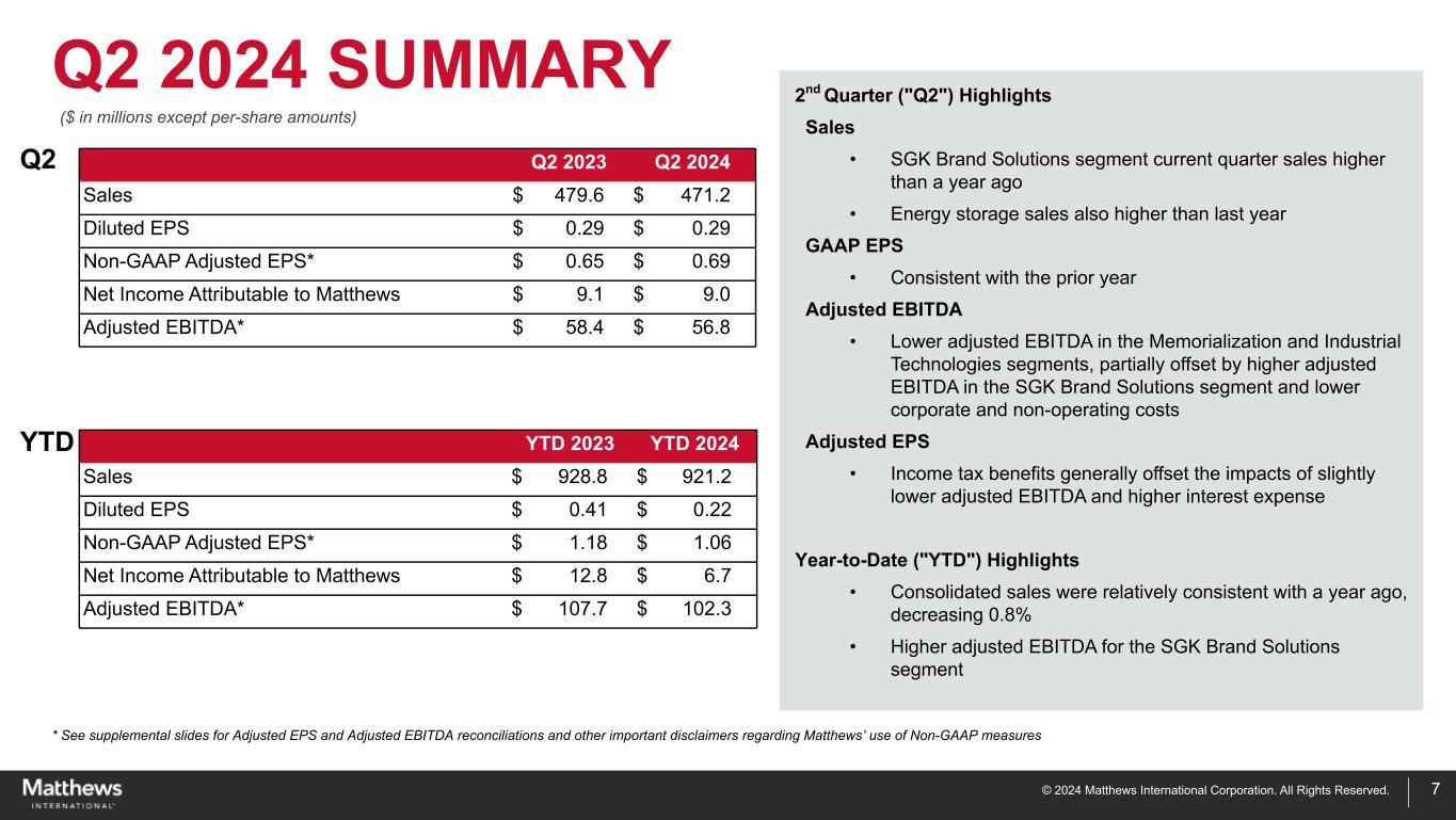 © 2024 Matthews International Corporation. All Rights Reserved. Q2 2024 SUMMARY 7 Q2 2023 Q2 2024 Sales $ 479.6 $ 471.2 Diluted EPS $ 0.29 $ 0.29 Non-GAAP Adjusted EPS* $ 0.65 $ 0.69 Net Income Attributable to Matthews $ 9.1 $ 9.0 Adjusted EBITDA* $ 58.4 $ 56.8 ($ in millions except per-share amounts) Q2 YTD YTD 2023 YTD 2024 Sales $ 928.8 $ 921.2 Diluted EPS $ 0.41 $ 0.22 Non-GAAP Adjusted EPS* $ 1.18 $ 1.06 Net Income Attributable to Matthews $ 12.8 $ 6.7 Adjusted EBITDA* $ 107.7 $ 102.3 2nd Quarter ("Q2") Highlights Sales • SGK Brand Solutions segment current quarter sales higher than a year ago • Energy storage sales also higher than last year GAAP EPS • Consistent with the prior year Adjusted EBITDA • Lower adjusted EBITDA in the Memorialization and Industrial Technologies segments, partially offset by higher adjusted EBITDA in the SGK Brand Solutions segment and lower corporate and non-operating costs Adjusted EPS • Income tax benefits generally offset the impacts of slightly lower adjusted EBITDA and higher interest expense Year-to-Date ("YTD") Highlights • Consolidated sales were relatively consistent with a year ago, decreasing 0.8% • Higher adjusted EBITDA for the SGK Brand Solutions segment * See supplemental slides for Adjusted EPS and Adjusted EBITDA reconciliations and other important disclaimers regarding Matthews’ use of Non-GAAP measures