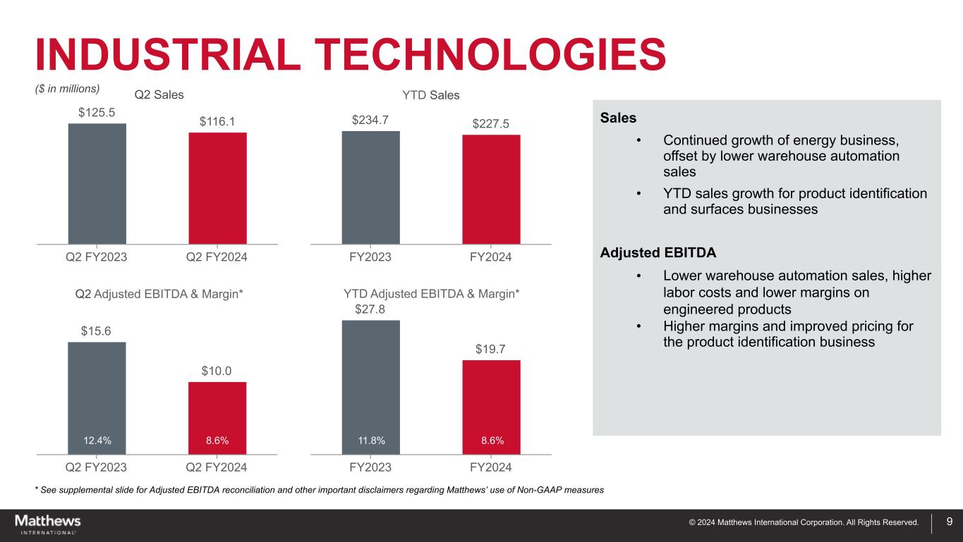 © 2024 Matthews International Corporation. All Rights Reserved. MEMORIALIZATION 8 23.0% 21.1% $222.9 $222.2 Q2 FY2023 Q2 FY2024 $429.4 $430.2 FY2023 FY2024 $48.0 $46.6 Q2 FY2023 Q2 FY2024 $87.2 $83.3 FY2023 FY2024 21.5% 21.0% 20.3% 19.4% ($ in millions) Q2 Sales Q2 Adjusted EBITDA & Margin* YTD Sales YTD Adjusted EBITDA & Margin* Sales • Benefits from recent acquisitions and improved price realization • U.S. death rates have normalized from higher pandemic levels, impacting unit volumes for caskets and memorials Adjusted EBITDA • Higher material and labor costs • Improved price realization and productivity initiatives * See supplemental slide for Adjusted EBITDA reconciliation and other important disclaimers regarding Matthews’ use of Non-GAAP measures