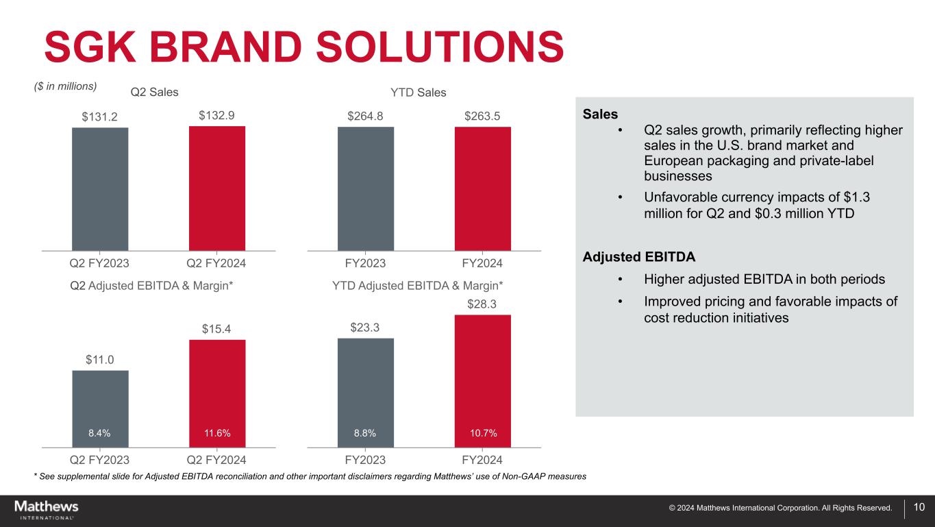 © 2024 Matthews International Corporation. All Rights Reserved. INDUSTRIAL TECHNOLOGIES 9 15.5% 12.4% 15.6%10.3% ($ in millions) $125.5 $116.1 Q2 FY2023 Q2 FY2024 $234.7 $227.5 FY2023 FY2024 $15.6 $10.0 Q2 FY2023 Q2 FY2024 $27.8 $19.7 FY2023 FY2024 12.4% 8.6% 11.8% 8.6% Q2 Sales Q2 Adjusted EBITDA & Margin* YTD Sales YTD Adjusted EBITDA & Margin* Sales • Continued growth of energy business, offset by lower warehouse automation sales • YTD sales growth for product identification and surfaces businesses Adjusted EBITDA • Lower warehouse automation sales, higher labor costs and lower margins on engineered products • Higher margins and improved pricing for the product identification business * See supplemental slide for Adjusted EBITDA reconciliation and other important disclaimers regarding Matthews’ use of Non-GAAP measures