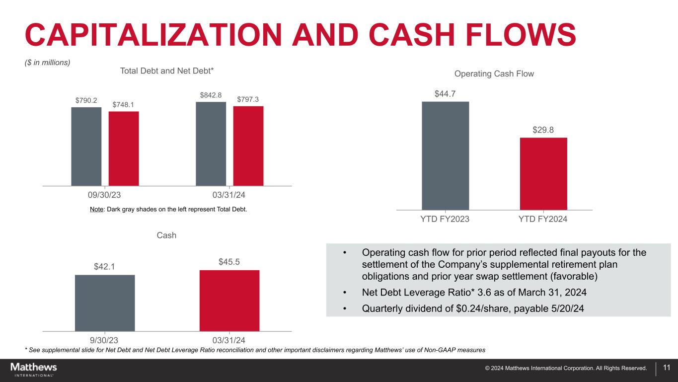 © 2024 Matthews International Corporation. All Rights Reserved. SGK BRAND SOLUTIONS ($ in millions) 10 15.4% 12.9% $131.2 $132.9 Q2 FY2023 Q2 FY2024 $264.8 $263.5 FY2023 FY2024 $11.0 $15.4 Q2 FY2023 Q2 FY2024 $23.3 $28.3 FY2023 FY2024 11.6%8.4% 8.8% 10.7% Q2 Sales Q2 Adjusted EBITDA & Margin* YTD Sales YTD Adjusted EBITDA & Margin* Sales • Q2 sales growth, primarily reflecting higher sales in the U.S. brand market and European packaging and private-label businesses • Unfavorable currency impacts of $1.3 million for Q2 and $0.3 million YTD Adjusted EBITDA • Higher adjusted EBITDA in both periods • Improved pricing and favorable impacts of cost reduction initiatives * See supplemental slide for Adjusted EBITDA reconciliation and other important disclaimers regarding Matthews’ use of Non-GAAP measures