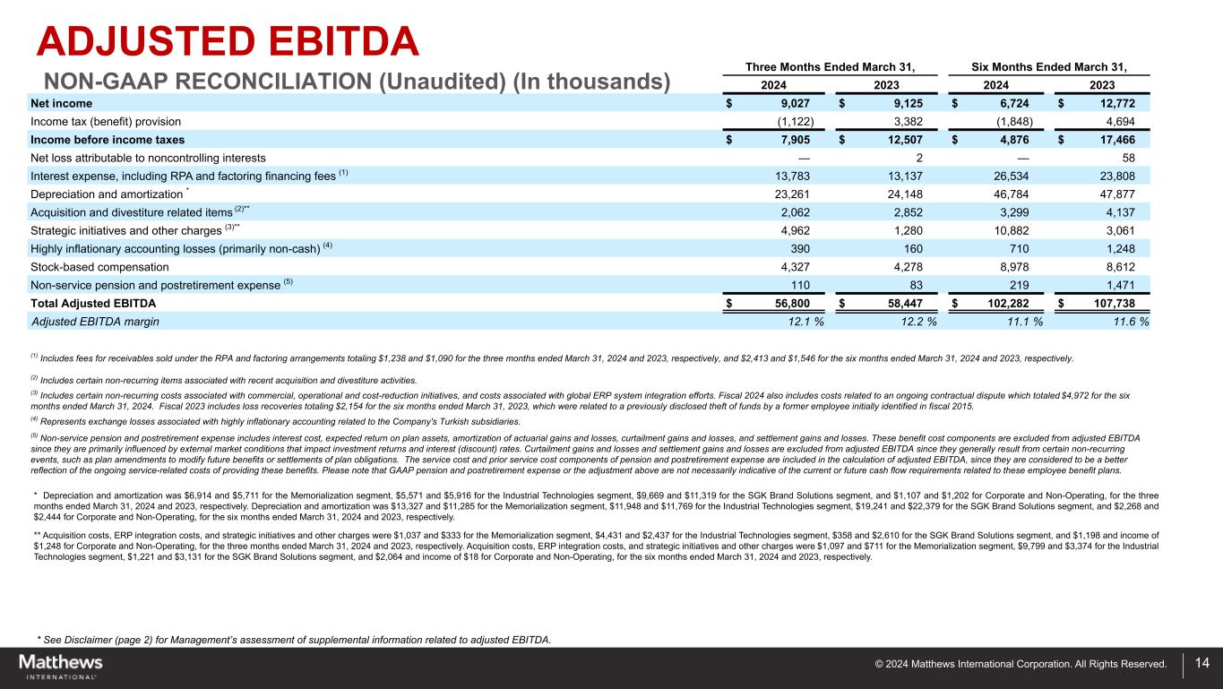 © 2024 Matthews International Corporation. All Rights Reserved. 13 Included in this report are measures of financial performance that are not defined by GAAP, including, without limitation, adjusted EBITDA, adjusted net income and EPS, constant currency sales, constant currency adjusted EBITDA, and net debt and net debt leverage ratio. The Company defines net debt leverage ratio as outstanding debt (net of cash) relative to adjusted EBITDA. The Company uses non-GAAP financial measures to assist in comparing its performance on a consistent basis for purposes of business decision-making by removing the impact of certain items that management believes do not directly reflect the Company’s core operations including acquisition and divestiture costs, ERP integration costs, strategic initiative and other charges (which includes non-recurring charges related to certain commercial and operational initiatives and exit activities), stock-based compensation and the non-service portion of pension and postretirement expense. Constant currency sales and constant currency adjusted EBITDA removes the impact of changes due to foreign exchange translation rates. To calculate sales and adjusted EBITDA on a constant currency basis, amounts for periods in the current fiscal year are translated into U.S. dollars using exchange rates applicable to the comparable periods of the prior fiscal year. Management believes that presenting non-GAAP financial measures is useful to investors because it (i) provides investors with meaningful supplemental information regarding financial performance by excluding certain items that management believes do not directly reflect the Company's core operations, (ii) permits investors to view performance using the same tools that management uses to budget, forecast, make operating and strategic decisions, and evaluate historical performance, and (iii) otherwise provides supplemental information that may be useful to investors in evaluating the Company’s results. The Company's calculations of its non-GAAP financial measures, however, may not be comparable to similarly titled measures reported by other companies. The Company believes that the presentation of these non-GAAP financial measures, when considered together with the corresponding GAAP financial measures and the reconciliations to those measures, provided herein, provide investors with an additional understanding of the factors and trends affecting the Company’s business that could not be obtained absent these disclosures. RECONCILIATIONS OF NON-GAAP FINANCIAL MEASURES