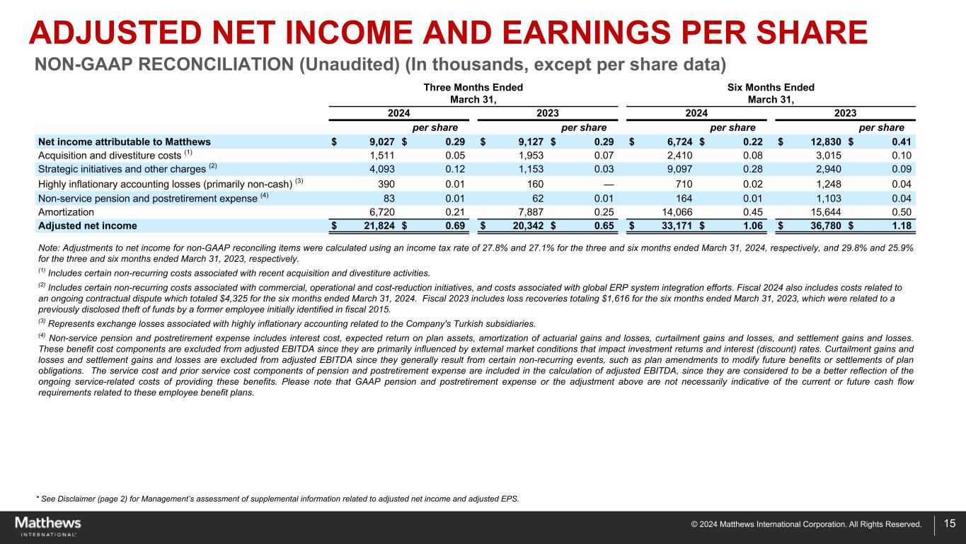 © 2024 Matthews International Corporation. All Rights Reserved. * See Disclaimer (page 2) for Management’s assessment of supplemental information related to adjusted EBITDA. 14 Three Months Ended March 31, Six Months Ended March 31, 2024 2023 2024 2023 Net income $ 9,027 $ 9,125 $ 6,724 $ 12,772 Income tax (benefit) provision (1,122) 3,382 (1,848) 4,694 Income before income taxes $ 7,905 $ 12,507 $ 4,876 $ 17,466 Net loss attributable to noncontrolling interests — 2 — 58 Interest expense, including RPA and factoring financing fees (1) 13,783 13,137 26,534 23,808 Depreciation and amortization * 23,261 24,148 46,784 47,877 Acquisition and divestiture related items (2)** 2,062 2,852 3,299 4,137 Strategic initiatives and other charges (3)** 4,962 1,280 10,882 3,061 Highly inflationary accounting losses (primarily non-cash) (4) 390 160 710 1,248 Stock-based compensation 4,327 4,278 8,978 8,612 Non-service pension and postretirement expense (5) 110 83 219 1,471 Total Adjusted EBITDA $ 56,800 $ 58,447 $ 102,282 $ 107,738 Adjusted EBITDA margin 12.1 % 12.2 % 11.1 % 11.6 % (1) Includes fees for receivables sold under the RPA and factoring arrangements totaling $1,238 and $1,090 for the three months ended March 31, 2024 and 2023, respectively, and $2,413 and $1,546 for the six months ended March 31, 2024 and 2023, respectively. (2) Includes certain non-recurring items associated with recent acquisition and divestiture activities. (3) Includes certain non-recurring costs associated with commercial, operational and cost-reduction initiatives, and costs associated with global ERP system integration efforts. Fiscal 2024 also includes costs related to an ongoing contractual dispute which totaled $4,972 for the six months ended March 31, 2024. Fiscal 2023 includes loss recoveries totaling $2,154 for the six months ended March 31, 2023, which were related to a previously disclosed theft of funds by a former employee initially identified in fiscal 2015. (4) Represents exchange losses associated with highly inflationary accounting related to the Company's Turkish subsidiaries. (5) Non-service pension and postretirement expense includes interest cost, expected return on plan assets, amortization of actuarial gains and losses, curtailment gains and losses, and settlement gains and losses. These benefit cost components are excluded from adjusted EBITDA since they are primarily influenced by external market conditions that impact investment returns and interest (discount) rates. Curtailment gains and losses and settlement gains and losses are excluded from adjusted EBITDA since they generally result from certain non-recurring events, such as plan amendments to modify future benefits or settlements of plan obligations. The service cost and prior service cost components of pension and postretirement expense are included in the calculation of adjusted EBITDA, since they are considered to be a better reflection of the ongoing service-related costs of providing these benefits. Please note that GAAP pension and postretirement expense or the adjustment above are not necessarily indicative of the current or future cash flow requirements related to these employee benefit plans. * Depreciation and amortization was $6,914 and $5,711 for the Memorialization segment, $5,571 and $5,916 for the Industrial Technologies segment, $9,669 and $11,319 for the SGK Brand Solutions segment, and $1,107 and $1,202 for Corporate and Non-Operating, for the three months ended March 31, 2024 and 2023, respectively. Depreciation and amortization was $13,327 and $11,285 for the Memorialization segment, $11,948 and $11,769 for the Industrial Technologies segment, $19,241 and $22,379 for the SGK Brand Solutions segment, and $2,268 and $2,444 for Corporate and Non-Operating, for the six months ended March 31, 2024 and 2023, respectively. ** Acquisition costs, ERP integration costs, and strategic initiatives and other charges were $1,037 and $333 for the Memorialization segment, $4,431 and $2,437 for the Industrial Technologies segment, $358 and $2,610 for the SGK Brand Solutions segment, and $1,198 and income of $1,248 for Corporate and Non-Operating, for the three months ended March 31, 2024 and 2023, respectively. Acquisition costs, ERP integration costs, and strategic initiatives and other charges were $1,097 and $711 for the Memorialization segment, $9,799 and $3,374 for the Industrial Technologies segment, $1,221 and $3,131 for the SGK Brand Solutions segment, and $2,064 and income of $18 for Corporate and Non-Operating, for the six months ended March 31, 2024 and 2023, respectively. ADJUSTED EBITDA NON-GAAP RECONCILIATION (Unaudited) (In thousands)