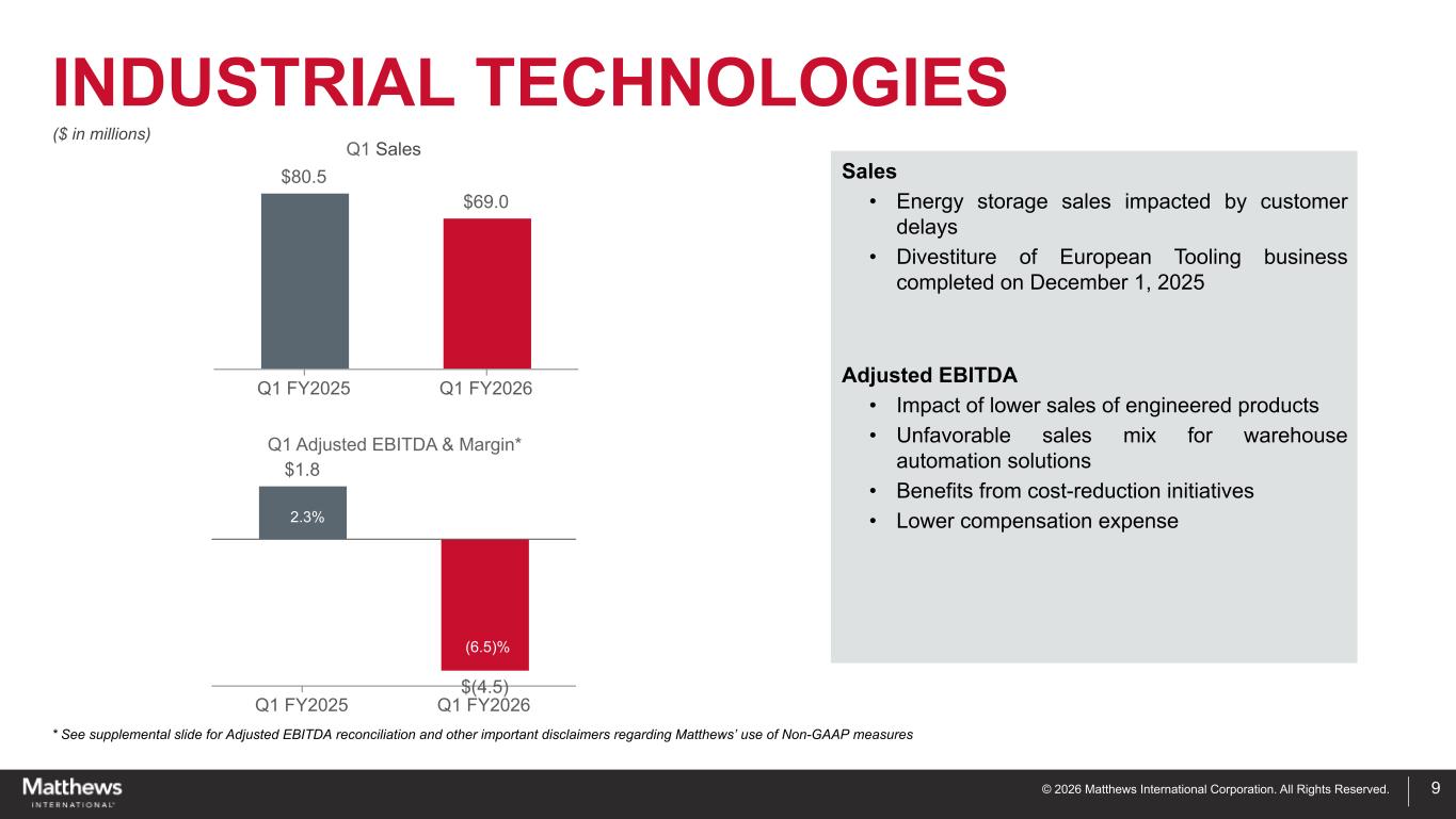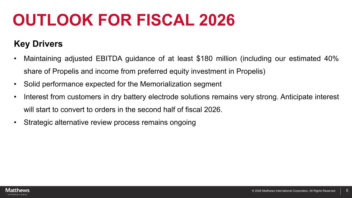 © 2026 Matthews International Corporation. All Rights Reserved. DISCLAIMER 2 Any forward-looking statements contained in this release are included pursuant to the “safe harbor” provisions of the Private Securities Litigation Reform Act of 1995. These forward-looking statements include, but are not limited to, statements regarding the expectations, hopes, beliefs, intentions or strategies of Matthews International Corporation and its consolidated subsidiaries (collectively “Matthews” or the “Company”) regarding the future, including statements regarding the anticipated benefits and risks associated with the joint venture transaction with Peninsula Parent LLC, d.b.a. Propelis Group ("Propelis") and the timing thereof, and may be identified by the use of words such as “expects,” “believes,” “intends,” “projects,” “anticipates,” “estimates,” “plans,” “seeks,” “forecasts,” “predicts,” “objective,” “targets,” “potential,” “outlook,” “may,” “will,” “could” or the negative of these terms, other comparable terminology and variations thereof. Such forward-looking statements involve known and unknown risks and uncertainties that may cause the Company's actual results in future periods to be materially different from management's expectations, and no assurance can be given that such expectations will prove correct. Factors that could cause the Company's results to differ materially from the results discussed in such forward-looking statements principally include risks to our ability to achieve the anticipated benefits of the joint venture transaction with Propelis that closed in fiscal year 2025, changes in domestic or international economic conditions, changes in foreign currency exchange rates, changes in interest rates, changes in the cost of materials used in the manufacture of the Company's products, including changes in costs due to adjustments to tariffs, any impairment of goodwill or intangible assets, environmental liability and limitations on the Company’s operations due to environmental laws and regulations, disruptions to certain services, such as telecommunications, network server maintenance, cloud computing or transaction processing services, provided to the Company by third-parties, changes in mortality and cremation rates, changes in product demand or pricing as a result of consolidation in the industries in which the Company operates, or other factors such as supply chain disruptions, labor shortages or labor cost increases, changes in product demand or pricing as a result of domestic or international competitive pressures, ability to achieve cost-reduction objectives, unknown risks in connection with the Company's acquisitions, divestitures, and business combinations, cybersecurity concerns and costs arising with management of cybersecurity threats, effectiveness of the Company's internal controls, compliance with domestic and foreign laws and regulations, technological factors beyond the Company's control, impact of pandemics or similar outbreaks, or other disruptions to our industries, customers, or supply chains, the impact of global conflicts, such as the current war between Russia and Ukraine, and conflicts and related sanctions or trade restrictions involving Venezuela, the Company's plans and expectations with respect to its exploration, and contemplated execution, of various strategies with respect to its portfolio of businesses, the Company's plans and expectations with respect to its Board of Directors, and other factors described in the Company’s Annual Report on Form 10-K and other periodic filings with the U.S. Securities and Exchange Commission. Included in this report are measures of financial performance that are not defined by generally accepted accounting principles in the United States (“GAAP”). The Company uses non-GAAP financial measures to assist in comparing its performance on a consistent basis for purposes of business decision-making by removing the impact of certain items that management believes do not directly reflect the Company’s core operations including acquisition and divestiture costs, enterprise resource planning ("ERP") system integration costs, strategic initiative and other charges (which includes non-recurring charges related to certain commercial and operational initiatives and exit activities), stock-based compensation and the non-service portion of pension and postretirement expense. Management believes that presenting non-GAAP financial measures is useful to investors because it (i) provides investors with meaningful supplemental information regarding financial performance by excluding certain items that management believes do not directly reflect the Company’s core operations, (ii) permits investors to view performance using the same tools that management uses to budget, forecast, make operating and strategic decisions, and evaluate historical performance, and (iii) otherwise provides supplemental information that may be useful to investors in evaluating the Company’s results. The Company believes that the presentation of these non-GAAP financial measures, when considered together with the corresponding GAAP financial measures and the reconciliations to those measures, provided herein, provides investors with an additional understanding of the factors and trends affecting the Company’s business that could not be obtained absent these disclosures. The Company believes that adjusted EBITDA provides relevant and useful information, which is used by the Company’s management in assessing the performance of its business. Adjusted EBITDA is defined by the Company as earnings before interest, income taxes, depreciation, amortization and certain non-cash and/or non-recurring items that do not contribute directly to management’s evaluation of its operating results. These items include stock-based compensation, the non-service portion of pension and