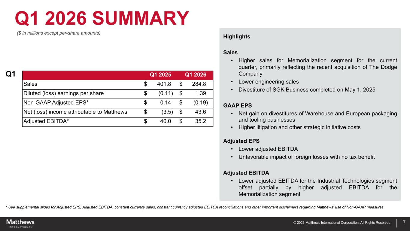 © 2026 Matthews International Corporation. All Rights Reserved. * See Disclaimer (page 2) for Management’s assessment of supplemental information related to adjusted EBITDA. 14 Three Months Ended December 31, 2025 2024 Net income (loss) $ 43,629 $ (3,472) Income tax provision (benefit) 40,789 (2,358) Income (loss) before income taxes $ 84,418 $ (5,830) Propelis depreciation, amortization, interest and other items (1) 15,203 — Interest expense, including RPA and factoring financing fees (2) 15,301 16,854 Depreciation and amortization * 12,696 22,504 Acquisition and divestiture related items (3)** 1,118 577 Strategic initiatives and other items (4)**† 15,250 615 Gains (losses) on divestitures, net (113,209) — Highly inflationary accounting losses (primarily non-cash) (5) 16 191 Stock-based compensation 4,407 4,979 Non-service pension and postretirement expense (6) 38 133 Total Adjusted EBITDA $ 35,238 $ 40,023 Adjusted EBITDA margin 12.4 % 10.0 % (1) Represents the Company's portion of depreciation, intangible amortization, interest expense, and other items incurred by Propelis. (2) Includes fees for receivables sold under the RPA and factoring arrangements totaling $668 and $1,172 for the three months ended December 31, 2025 and 2024, respectively. (3) Includes certain non-recurring items associated with recent acquisition and divestiture activities. (4) Includes certain non-recurring costs associated with commercial, operational and cost-reduction initiatives, and costs associated with global ERP system integration efforts. Also includes legal costs related to an ongoing dispute with Tesla, which totaled $8,997 and $6,867 for the three months ended December 31, 2025 and 2024, respectively. Fiscal 2025 includes net gains on the sales of certain significant property and other assets of $8,702. Fiscal 2025 also includes loss recoveries totaling $1,170 for the three months ended December 31, 2025 which were related to a previously disclosed theft of funds by a former employee initially identified in fiscal 2015. 5) Represents exchange losses associated with highly inflationary accounting related to the Company's Turkish subsidiaries. (6) Non-service pension and postretirement expense includes interest cost, expected return on plan assets, amortization of actuarial gains and losses, curtailment gains and losses, and settlement gains and losses. These benefit cost components are excluded from adjusted EBITDA since they are primarily influenced by external market conditions that impact investment returns and interest (discount) rates. Curtailment gains and losses and settlement gains and losses are excluded from adjusted EBITDA since they generally result from certain non-recurring events, such as plan amendments to modify future benefits or settlements of plan obligations. The service cost and prior service cost components of pension and postretirement expense are included in the calculation of adjusted EBITDA, since they are considered to be a better reflection of the ongoing service-related costs of providing these benefits. Please note that GAAP pension and postretirement expense or the adjustment above are not necessarily indicative of the current or future cash flow requirements related to these employee benefit plans. * Depreciation and amortization was $8,147 and $7,202 for the Memorialization segment, $3,478 and $5,674 for the Industrial Technologies segment, $609 and $8,860 for the Brand Solutions segment, and $462 and $768 for Corporate and Non-Operating, for the three months ended December 31, 2025 and 2024, respectively. ** Acquisition and divestiture costs, ERP system integration costs, and strategic initiatives and other charges were $69 and $1,303 for the Memorialization segment, $10,353 and $4,119 for the Industrial Technologies segment, $3,493 and $714 for the Brand Solutions segment, and charges of $2,453 and income of $4,944 for Corporate and Non-Operating, for the three months ended December 31, 2025 and 2024, respectively. † Strategic initiatives and other items includes charges for exit and disposal activities (including severance and other employee termination benefits) totaling expenses of $1,523 and $313 for the three months ended December 31, 2025 and 2024, respectively. ADJUSTED EBITDA NON-GAAP RECONCILIATION (Unaudited) (In thousands)