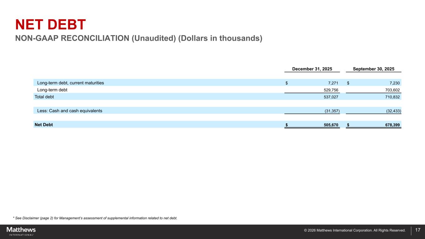 © 2026 Matthews International Corporation. All Rights Reserved. * See Disclaimer (page 2) for Management’s assessment of supplemental information related to net debt. 17 December 31, 2025 September 30, 2025 Long-term debt, current maturities $ 7,271 $ 7,230 Long-term debt 529,756 703,602 Total debt 537,027 710,832 Less: Cash and cash equivalents (31,357) (32,433) Net Debt $ 505,670 $ 678,399 NET DEBT NON-GAAP RECONCILIATION (Unaudited) (Dollars in thousands)